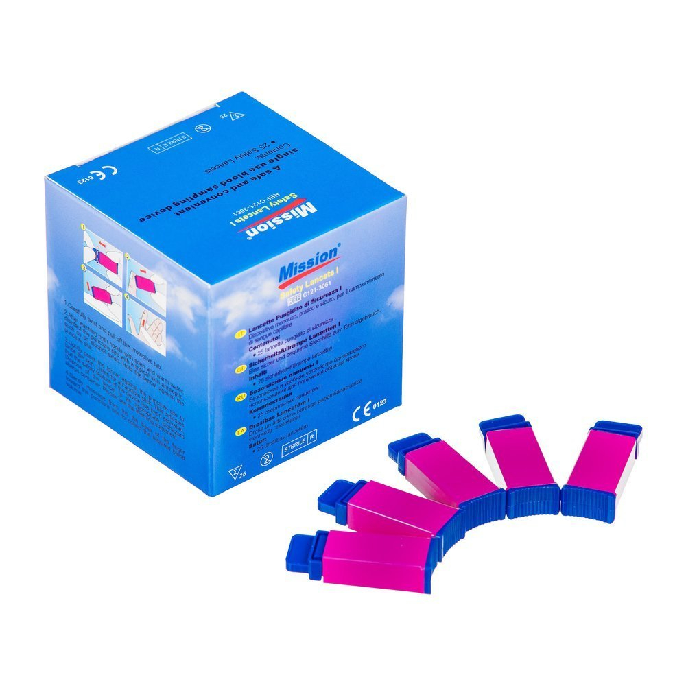 NAKŁUWACZE/LANCETY MISSION SAFETY LANCETS (25 SZT.) Urządzenie nakłuwające razem ze specjalnymi, jednorazowymi, sterylnymi igłami służy do nakłuwania palca i umożliwia uzyskanie krwi kapilarnej z palca potrzebnej do wykonania oznaczeń z niewielkiej ilość krwi. NAKŁUWACZE/LANCETY MISSION SAFETY LANCETS – opakowanie 25 szt. Przeznaczenie: Urządzenie nakłuwające razem ze specjalnymi, jednorazowymi, sterylnymi igłami służy do nakłuwania palca i umożliwia uzyskanie krwi kapilarnej z palca potrzebnej do wykonania oznaczeń z niewielkiej ilość krwi. Instrukcja użycia: Przed wykonaniem oznaczenia należy wybrać czystą i suchą powierzchnię, na której będzie wykonywane oznaczenie, zapoznać się z instrukcją stosowania urządzenia nakłuwającego i upewnić się, że wszystkie elementy potrzebne do uzyskania kropli krwi są przygotowane.Uwaga: Przed wykonaniem oznaczenia miejsce nakłucia należy zdezynfekować gazikiem nasączonym alkoholem lub umyć ręce wodą z mydłem. W razie potrzeby, w celu zwiększenia ciśnienia krwi, dłonie można ogrzać w ciepłej wodzie. Delikatnie osuszyć dłonie i miejsce nakłucia. Upewnić się, że miejsce nakłucia jest czyste, nie pokryte kremem, ani balsamem.