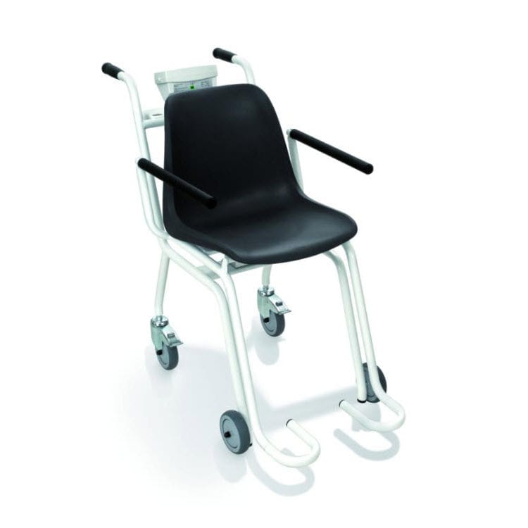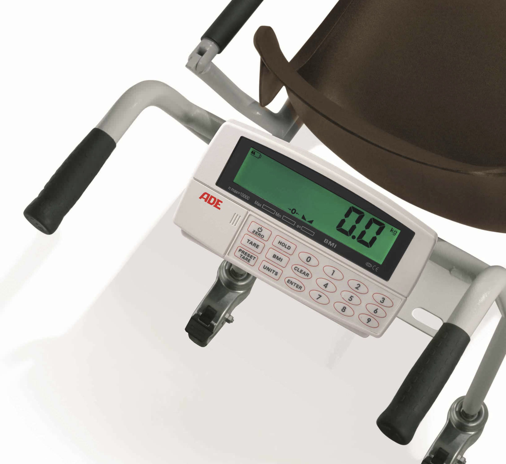 Waga krzesełkowa ADE Obracające się stopy i podłokietniki, 4 koła umożliwiające manewrowanie wagą oraz dwa hamulce na tylnych kołach, Tara i funkcja przytrzymania. Waga zasilana jest przez ładowane akumulatory lub podłączenie do sieci. Automatyczne zerowanie, Funkcja Tarowania oraz Hold, Wskaźnik BMI, Interfejs szeregowy RS 232