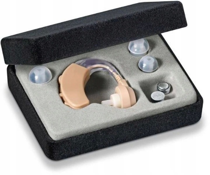 Aparat zaprojektowany przez niemieckich specjalistów, idealny dla osób z ograniczoną zdolnością słyszenia. Komfortowo dopasowany do ucha. Uniwersalny do lewego i prawego ucha dzięki elastycznemu połączeniu. Dla jeszcze lepszego dopasowania w zestawie znajdują się 3 wymienne końcówki do indywidualnego dopasowania aparatu do ucha. Aparat jest zaprojektowany do używania na dworze jak i w domu. Świetna jakość dźwięku. Wzmacnia głośność wszystkich dźwięków (w całym zakresie słyszalności czyli od 200 do 5000 Hz). Świetna jakość dźwięku. Bardzo prosta obsługa. Maksymalny dźwięk wychodzący: 128 dB. Wymiary produktu: 40 x 40 x 12 mm. Etui na aparat (pluszowe lub plastikowe). W zestawie 2 baterie. Idealny dla osób mających problemy ze słuchem. Wzmacnia głośność wszystkich dźwięków, zarówno w pomieszczeniach jak i na zewnątrz. W zestawie 3 nakładki o różnych rozmiarach, umożliwiających idealne dopasowanie do kanału słuchowego. Ergonomicznie wyprofilowany, dla wygodnego mocowania za uchem. 4 poziomy głośności do wyboru. Wzmocnienie dźwięków: maksymalnie 40 dB. Maksymalna głośność: 128 dB. Zakres częstotliwości: 200 – 5000 Hz. Wymiary: 40 x 40 x 12 mm. Zasilanie: bateria LR754. W zestawie bateria zasilająca i 3 baterie zapasowe. Cały zestaw zapakowany w eleganckie pudełko pokryte welurem lub pudełko plastikowe. Instrukcja obsługi w języku polskim.