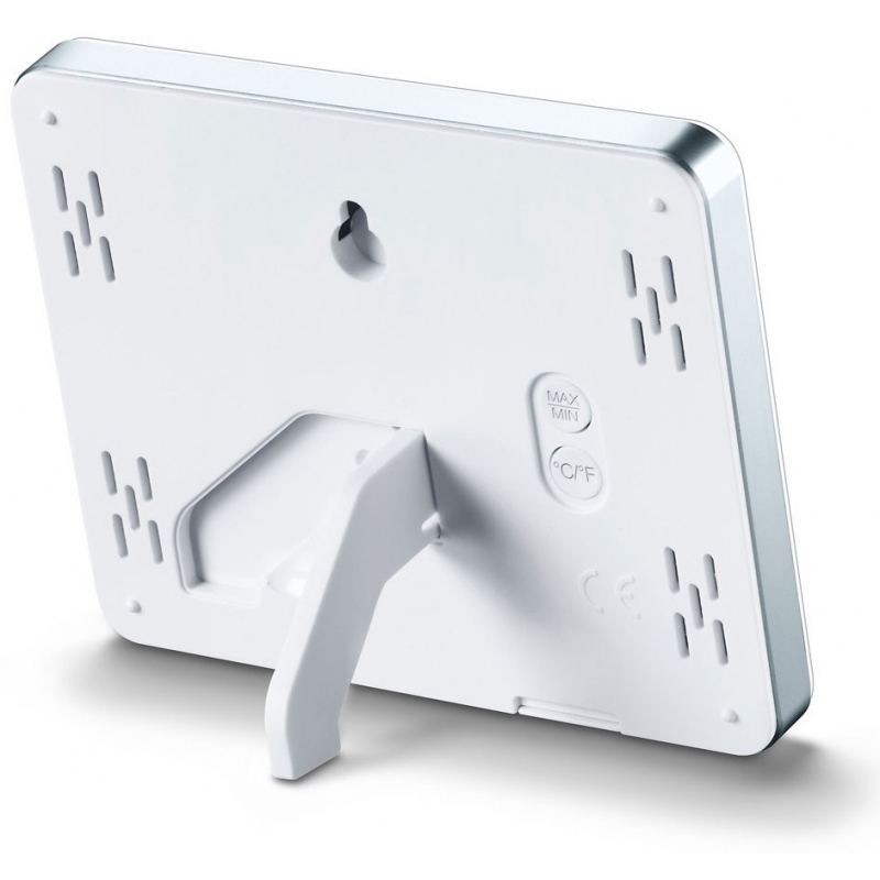 Opis produktu Wyświetlanie wartości maksymalnych/ minimalnych temperatury i względnej wilgotności powietrza Wyświetlacz z emotikonami :) = 20-25 stopni Celsjusza, 30%-60%, wilgotność (idealna wilgotność) :/= każda temperatura, 60% wilgotność (duża wilgotność) Możliwość przełączania °C/°F Rozkładany stojak stołowy i zawieszka do montażu na ścianie W zestawie 1 bateria CR2025 Gwarancja: 3 lata Wymiary: 99 × 81 × 11 mm