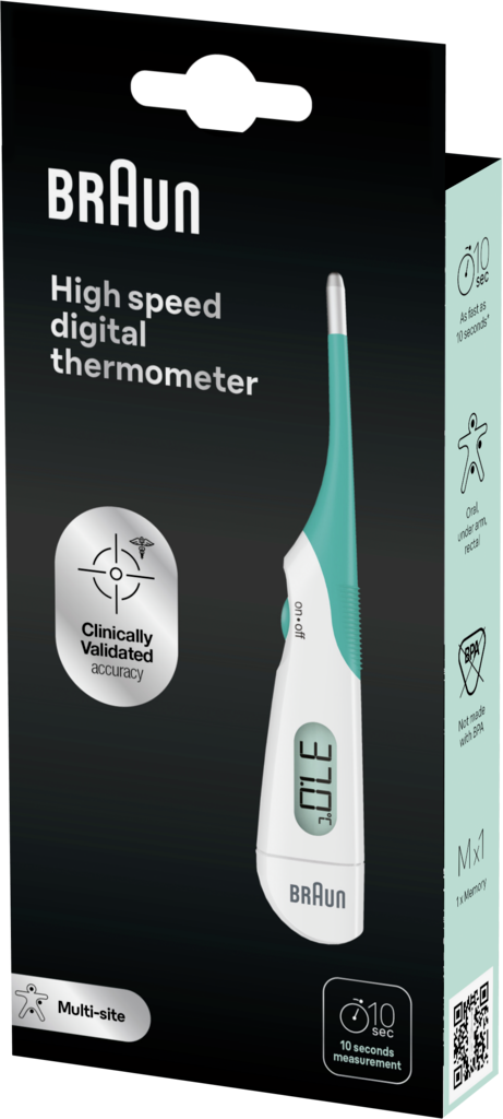 Termometr cyfrowy do szybkich pomiarów Braun (PRT1000) Zaufaj marce nr 1 polecanej przez lekarzy1 1Braun jest wiodącą marką pod względem świadomości, rekomendacji i stosowania w domu według ankietowanych lekarzy. GFK, badanie online na grupie n=800 lekarzy pierwszego kontaktu i pediatrów w czterech krajach europejskich (n=200 osób w DE, UK, FR, NL), przeprowadzone od listopada do grudnia 2022 r. DO STOSOWANIA W WIELU MIEJSCACH: Ten termometr cyfrowy jest odpowiedni do pomiaru temperatury w jamie ustnej, odbycie lub pod pachą. KLINICZNIE POTWIERDZONA DOKŁADNOŚĆ: Zmierz temperaturę w domu mając pewność, że dokładność pomiaru termometrem Braun jest potwierdzona klinicznie. Termometr cyfrowy do szybkich pomiarów Braun – idealne rozwiązanie do dokładnych pomiarów temperatury w domu i w podróży. Dokładność tego kompaktowego urządzenia cyfrowego z elastyczną końcówką została potwierdzona klinicznie; jest ono przeznaczone dla całej rodziny, od noworodków po dorosłych. Idealny do zastosowań w domu i w podróży, oferuje elastyczność pomiarów w jamie ustnej, odbycie lub pod pachą, zapewniając szybkie i dokładne wyniki w zaledwie 10 sekund.* Zaufaj marce nr 1 wśród lekarzy 1 dzięki cyfrowemu termometrowi do szybkich pomiarów Braun umożliwiającemu dokładne odczyty temperatury. Absolutny niezbędnik w każdym gospodarstwie domowym. *Czas testów laboratoryjnych wynosił średnio mniej niż 10 sekund, doświadczenie w użyciu może się różnić. SZYBKIE ODCZYTY: Uzyskaj szybkie i dokładne wyniki w zaledwie 10 sekund* DELIKATNA, ELASTYCZNA KOŃCÓWKA: Zapewnia komfortowe stosowanie przez całą rodzinę, od dorosłych po dzieci i niemowlęta. Opakowanie i kolory produktu mogą nieznacznie różnić się od przedstawionych na zdjęciach. Niektóre znaki towarowe zostały wykorzystane na podstawie licencji firmy The Procter & Gamble Company lub jej podmiotów stowarzyszonych.