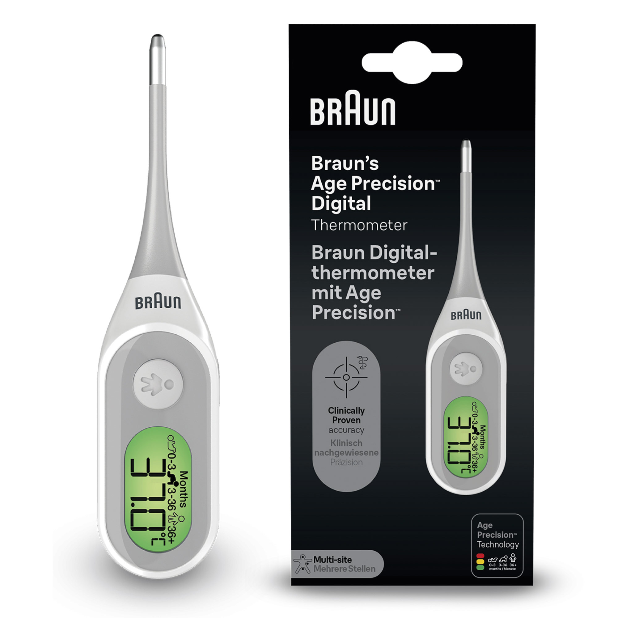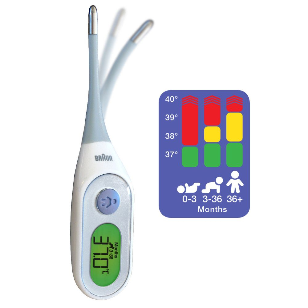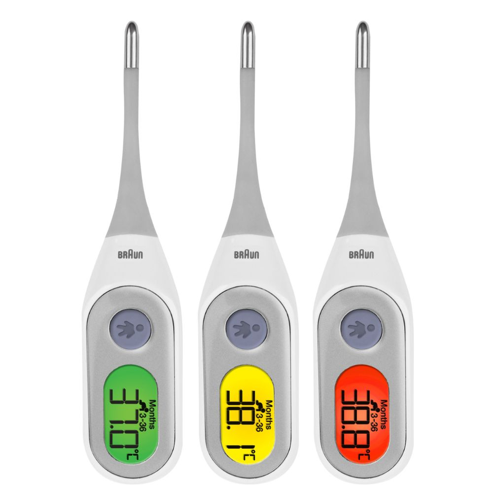 Braun Age Precision® Termometr cyfrowy (PRT2000) TERMOMETR ELEKTRONICZNY: uzyskaj wiarygodne wyniki przy pomocy termometru cyfrowego firmy Braun z technologią Age Precision®. KLINICZNIE POTWIERDZONA DOKŁADNOŚĆ: Zmierz temperaturę w domu z pewnością, że dokładność pomiaru termometrem Braun jest potwierdzona klinicznie SZYBKIE ODCZYTY: Z technologią Age Precision® uzyskaj szybkie i dokładne wyniki dostosowane do wieku w zaledwie 8 sekund*. DELIKATNA, ELASTYCZNA KOŃCÓWKA: Zapewnia bardzo komfortowe stosowanie przez całą rodzinę, od dorosłych po dzieci i niemowlęta. MOŻLIWOŚĆ WYBORU MIEJSCA POMIARU: Ten termometr cyfrowy jest odpowiedni do pomiaru temperatury w jamie ustnej, odbytnicy lub pod pachą. Termometr cyfrowy Age Precision® firmy Braun zapewnia klinicznie potwierdzoną dokładność podczas pomiaru w domu, podając szybkie i wiarygodne odczyty dla całej rodziny, od małych dzieci po dorosłych. Ten kompaktowy termometr cyfrowy z elastyczną końcówką jest odpowiedni do użytku domowego i pomiaru temperatury w jamie ustnej, odbytnicy lub pod pachą i podaje odczyty w zaledwie 8 sekund2. Technologia Age Precision® uwzględnia dostosowane do wieku progi dla określenia gorączki, w celu zapewnienia jak najdokładniejszego pomiaru3,4. Pomiar temperatury od marki nr 1 wśród lekarzy1 . Opakowanie i kolory produktu mogą nieznacznie różnić się od przedstawionych na zdjęciach. 1Braun jest wiodącą marką pod względem świadomości, rekomendacji i stosowania w domu według ankietowanych lekarzy. GFK, badanie online na grupie n=800 lekarzy pierwszego kontaktu i pediatrów w czterech krajach europejskich (n=200 osób w DE, UK, FR, NL), przeprowadzone od listopada do grudnia 2022 r. 2Results will vary by individual and method used. Internal testing results ranged from 8.4 to 14.1 seconds. 3Próg pomiaru gorączki w oparciu o wiek zapewnia znacząco skuteczniejszą ocenę choroby niż zwykły pomiar ze stałymi wskaźnikami gorączki. Kasbekar R., Naz A., Marcos L. i in. Próg dla określenia gorączki różni się w zależności od wieku, zwłaszcza u dzieci: Badanie dokładności diagnostycznej w wielu ośrodkach. Nursing Open, 2021; 8: 2705-2721 (badanie sponsorowane przez Kaz USA, Inc.). 4Herzog L., Phillips SG,. Addressing concerns about fever. Clinical Pediatrics. 2011; 50 (#5): 383-390. Age Precision® jest znakiem towarowym Helen of Troy i/lub jej podmiotów stowarzyszonych.