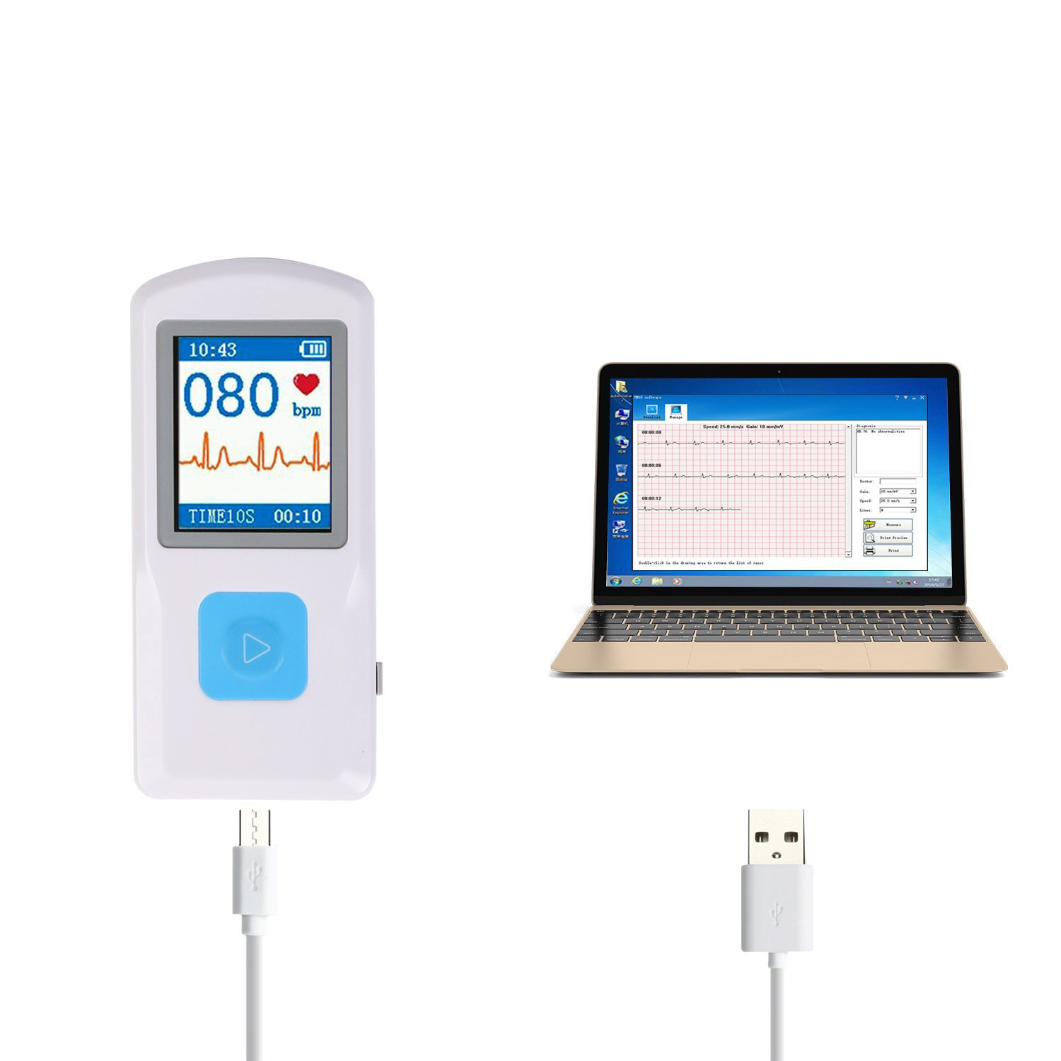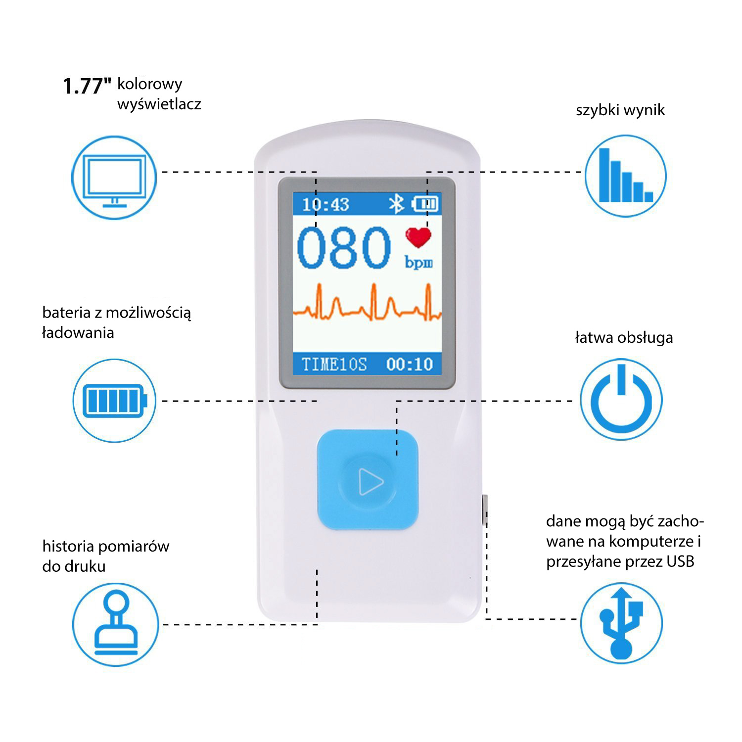 PM10 Przenośny monitor EKG Elektrokardiograf PM10 to przenośny / poręczy aparat EKG. Urządzenie to pozwala na sprawdzenie odprowadzeń EKG i ma zastosowanie m.in. dla indywidualnego użytkownika jak również w praktyce lekarskiej do przesiewowego badania wszystkich odprowadzeń EKG. Sprawdza się we wczesnym zapobieganiu chorobom układu krążenia i zmniejszenie ryzyka zawału serca. Inteligentne rozwiązanie pozwala na zdalne zarządzanie stanem zdrowia. Aparat PM10 wykorzystuje z aplikację mobilną (na Smart Phony), może automatycznie rozpocząć pomiar EKG, zdalnie przesyłać dane w celu uzyskania natychmiastowej porady lekarza. Aparat EKG PM10 ma zastosowanie u pacjentów z różnymi rodzajami chorób przewlekłych, szczególnie przy chorobie wieńcowej serca, cukrzycy, nadciśnieniu, otyłości, zapalenia mięśnia sercowego, bólów w klatce piersiowej, kołataniu serca oraz w przypadkach występowania duszność. 1) Polski interfejs2) Możliwość zmiany czasu pomiaru: 10s, 15s, 30s (po zainstalowaniu darmowego oprogramowania na PC) 3) Wyświetlacz 1,77 “TFT-LCD 4) Szybkie i wygodne sprawdzenie EKG5) Precyzyjny wynik badania można uzyskać bezpośrednio po pomiarze.6) Wbudowany akumulator litowy zezwala na zrealizowanie w sposób ciągły do 500 pomiarów (przy pełnym naładowaniu).7) Transmisja Bluetooth.8) Pozyskane dane EKG można zapisać na stałe w chmurze do wygodnego sprawdzania i analizowania.9) Dane historyczne mogą być wydrukowane w dowolnym momencie. Wymiary: 100mm (L) x 45 mm (szer) x 15mm (H)Waga: około 60g
