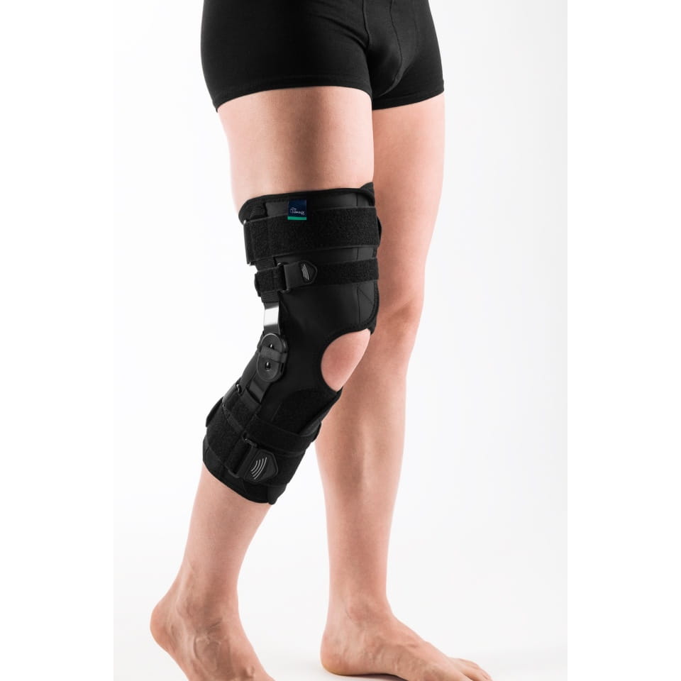 Orteza stawu kolanowego Timago posiada w komplecie kliny blokujące zakres ruchomości w zgięciu oraz wyproście. Policentryczne szyny stabilizują niestabilny staw kolanowy w kierunku bocznym i przyśrodkowym. Zastosowanie dodatkowych pasów obwodowych zwiększa stabilność oraz utrzymuje właściwe położenie.