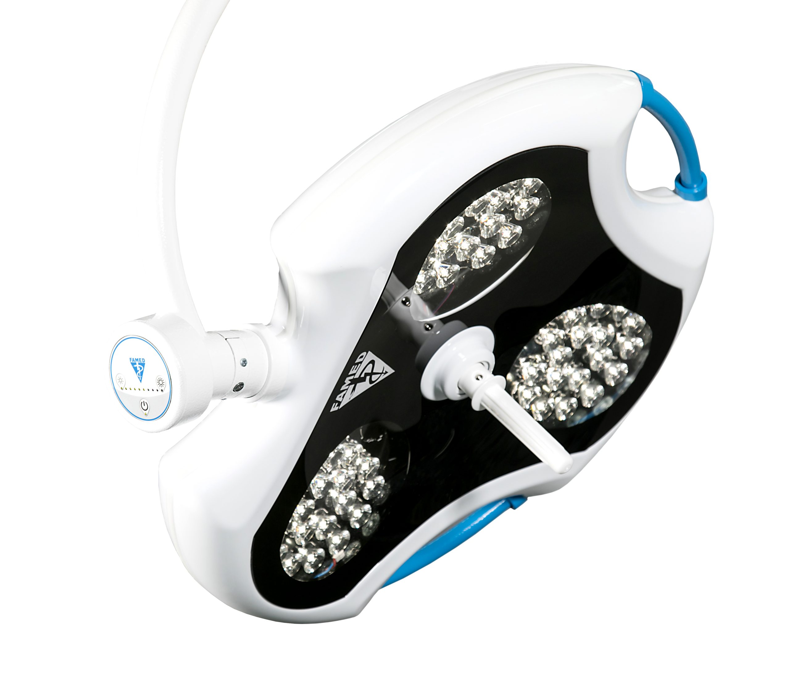 Lampa operacyjna HELIOS 160 wykorzystuje jako źródło światła białe diody LED. Lampa przeznaczona jest do zastosowania w salach operacyjnych. Lampa operacyjna HELIOS 160 składa się z trzech niezależnych paneli świetlnych, w których znajdują się łącznie 54 diody, umożliwiające osiągnięcie natężenia oświetlenia 160 000 lux. Pozycjonowanie lampy umożliwiają: uchwyt sterylny umieszczony w centrum kopuły, oraz dwa uchwyty “brudne” znajdujące się na jej obwodzie. Uchwyt sterylny służy również do regulacji średnicy plamy świetlnej, natomiast regulację natężenia oświetlenia umożliwia panel sterujący, umieszczony na ramieniu kopuły. Lampy z serii HELIOS występują w wersjach: sufitowej, ściennej oraz statywowej (w tym z zasilaniem akumulatorowym). Panel sterowania – wyposażony w przycisk włącz/wyłącz oraz regulację natężenia światła. Sterylny uchwyt umożliwiający ustawianie ostrości plamy świetlnej w polu operacyjnym. Trzy oddzielne źródła światła przewidziane na wypadek uszkodzenia jednego z nich – wówczas pozostałe dwa źródła zapewniają wystarczające oświetlenie. W kopule nie przewidziano żadnych zewnętrznych wkrętów, ani innych elementów mocujących. Gładka powierzchnia i dopasowane części umożliwiają utrzymanie lampy w czystości. DANE TECHNICZNETyp oprawy – HELIOS 160 Napięcie zasilania – 24V DC Natężenie w odległości 1m – 160 000 luksów Zakres natężeni regulacjia oświetlenia – 25 ÷ 100% Wskaźnik oddawania barw Ra – 96 Temperatura barwowa – 4400 k Średnica pola roboczego d10 – 210 mm Średnica pola roboczego d50 – 105 mm Regulowana średnica pola roboczego – tak Przyrost temperatury w okolicy głowy chirurga < 1°C Wgłębność oświetlenia L1+L2 (20%) – 68 cm (60%) – 47 cm energii przez Zużycie oświetleniową – 55 W Klasa izolacji – I Stopień ochrony obudowy – IP 43