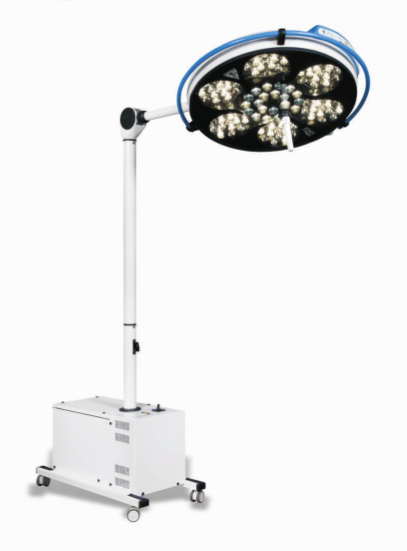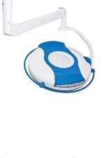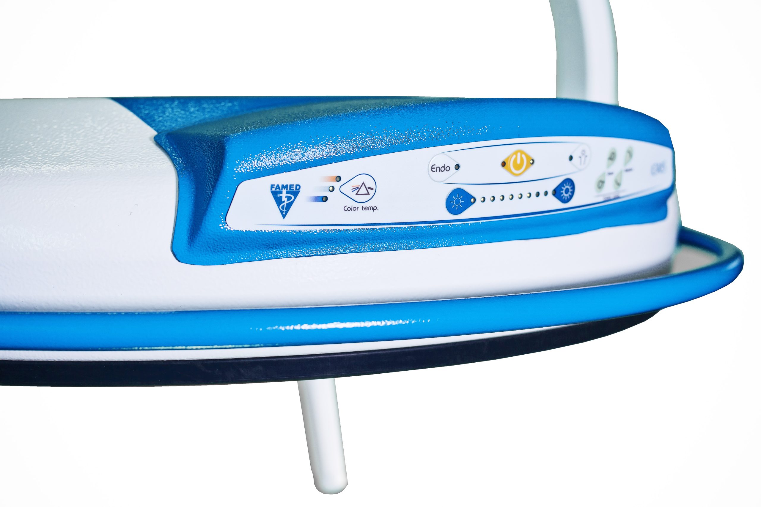 Lampa operacyjna statywowa FAMED IGNIS 160F Lampy operacyjne IGNIS 160 to seria lamp wykorzystująca białe diody LED jako źródło światła do oświetlenia pola operacyjnego. Kopuła wykonana z aluminium malowanego proszkowo ze szkłem bezpiecznym w dolnej części. Budowa lampy Lampa operacyjna IGNIS zbudowana jest z 6 segmentów bocznych oraz z jednego centralnego, w których występuje łącznie 110 diod umożliwiających osiągnięcie natężenia oświetlenia 160 000 lux. IGNIS 160 został wyposażony w dwa uchwyty. Sterylny uchwyt zapewnia możliwość ustawiania wielkości plamy świetlnej. Niesterylny uchwyt otacza kopułę na długości ok 75% jej obwodu, co zapewnia niezależny dostęp. Kopuła jest zabezpieczona przed zalaniem cieczą i przed wnikaniem kurzu. : funkcja zmiennej temperatury barwowej (4000-4400- 4800K), funkcja światła barwy zielonej dla potrzeb procedur endoskopowych, funkcję poprawy wgłębności światła, funkcję sterowania dwoma podstawowymi funkcjami kamery – obrót kamery i zoom- w wersjach z kamerą HD. Okrągła i wyprofilowana konstrukcja oraz niska temperatura pracy lampy powoduje, że IGNIS nie zakłóca przepływu laminarnego, a duża ilość źródeł światła gwarantuje bezcieniowość. zastosowanie białych diod LED eliminuje możliwość występowania zjawiska dyfrakcji regulowana temperatura barwowa zapewniająca doskonałe rozróżnianie kolorów współczynnik odwzorowania barw bezcieniowość żywotność źródła światła do 50 000 h Lampa może być wyposażona w kamerę wysokiej rozdzielczości full HD, która może być sterowana przy użyciu dwóch paneli sterujących umieszczonych na kopule. Centralny panel świetlny. Zapewnia równomierną plamę światła w polu operacyjnym, bez względu na odległość kopuły. Lampa posiada niezależną funkcję światła endoskopowego generowanego w górnej części kopuły. Panel sterowania umożliwia zmianę parametrów światła i kamery. Kopuła posiada dwa identyczne panele sterowania.