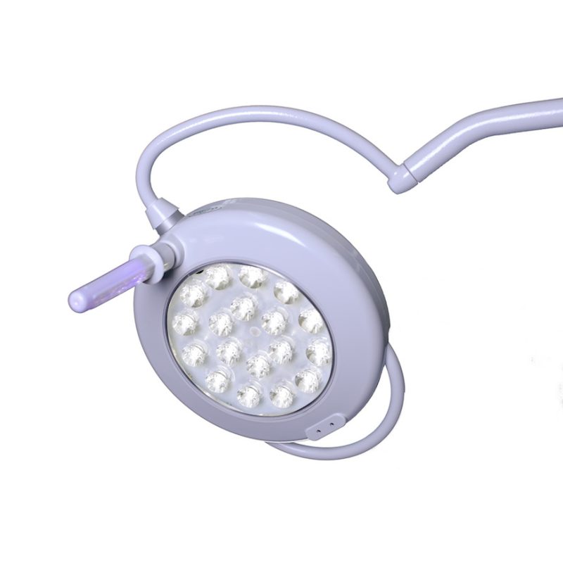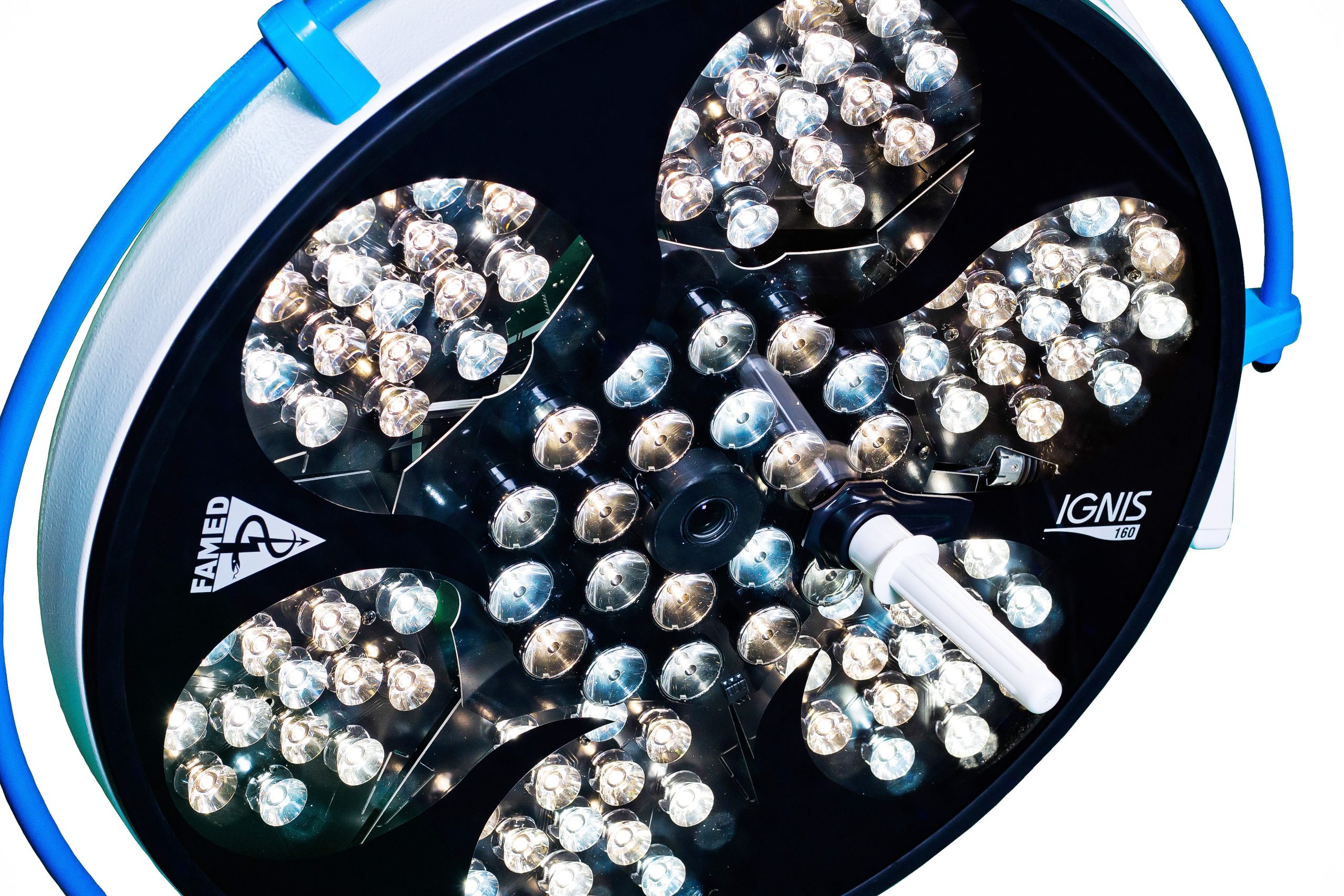 Lampa operacyjna statywowa z awaryjnym zasilaniem FAMED IGNIS 160FA Lampy operacyjne IGNIS 160 to seria lamp wykorzystująca białe diody LED jako źródło światła do oświetlenia pola operacyjnego. Kopuła wykonana z aluminium malowanego proszkowo ze szkłem bezpiecznym w dolnej części. Budowa lampy Lampa operacyjna IGNIS zbudowana jest z 6 segmentów bocznych oraz z jednego centralnego, w których występuje łącznie 110 diod umożliwiających osiągnięcie natężenia oświetlenia 160 000 lux. IGNIS 160 został wyposażony w dwa uchwyty. Sterylny uchwyt zapewnia możliwość ustawiania wielkości plamy świetlnej. Niesterylny uchwyt otacza kopułę na długości ok 75% jej obwodu, co zapewnia niezależny dostęp. Kopuła jest zabezpieczona przed zalaniem cieczą i przed wnikaniem kurzu. funkcja zmiennej temperatury barwowej (4000-4400- 4800K), funkcja światła barwy zielonej dla potrzeb procedur endoskopowych, funkcję poprawy wgłębności światła, funkcję sterowania dwoma podstawowymi funkcjami kamery – obrót kamery i zoom- w wersjach z kamerą HD. Okrągła i wyprofilowana konstrukcja oraz niska temperatura pracy lampy powoduje, że IGNIS nie zakłóca przepływu laminarnego, a duża ilość źródeł światła gwarantuje odpowiednią bezcieniowość. zastosowanie białych diod LED eliminuje możliwość występowania zjawiska dyfrakcji. regulowana temperatura barwowa zapewniająca rozróżnianie kolorów współczynnik odwzorowania barw bezcieniowość żywotność źródła światła do 50 000 h Lampa może być wyposażona w kamerę wysokiej rozdzielczości full HD, która może być sterowana przy użyciu dwóch paneli sterujących umieszczonych na kopule. Centralny panel świetlny. Zapewnia równomierną plamę światła w polu operacyjnym. Lampa posiada funkcję światła endoskopowego generowanego w górnej części kopuły. Panel sterowania umożliwia zmianę parametrów światła i kamery. Kopuła posiada dwa identyczne panele sterowania.