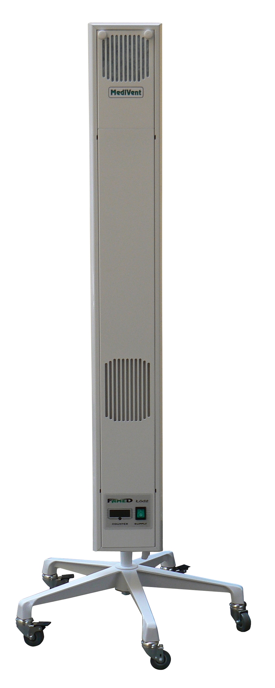 MEDIVENT 2×55 W – przepływowe, statywowe urządzenie bakteriobójcze Lampy bakteriobójcze przepływowe z dwoma promiennikami znajdującymi się wewnątrz. Lampy przepływowe MEDIVENT powinny być stosowane wszędzie tam, gdzie wymagany jest wysoki poziom sterylności pomieszczeń przy jednoczesnym przebywaniu w nich personelu. Dezynfekcja powietrza w lampach przepływowych odbywa się wewnątrz zamkniętej komory, dzięki czemu są one bezpieczne dla znajdujących się w pomieszczeniu ludzi, zwierząt i roślin. Skażone powietrze zasysane jest przez wentylator do wnętrza komory dezynfekcyjnej. Najpierw przechodzi ono przez filtr, który zatrzymuje kurz i inne pyły, a następnie przepływa przez komorę z małą prędkością, bezpośrednio przy promiennikach UV i na zewnątrz oczyszczone mikrobiologicznie. Promieniowanie UV-C m.in. przy niskociśnieniowych rtęciowych wyładowaniach (promienniki bakteriobójcze). Do wytworzenia promienników TUV jest stosowane specjalne szkło kwarcowe, które posiada wysoki współczynnik transmisji dla promieniowania bakteriobójczego, przy czym absorbuje niepożądane promieniowanie UV o długości po 200 nm, które tworzy ozon w powietrzu. Zatem promienniki TUV wytwarzają znikomą ilość ozonu i tylko podczas pierwszych 100 godz. świecenia, natomiast 95% energii emitują przy długości fali 253,7 nm zbliżonej do maksimum skuteczności bakteriobójczej. Wielość parametrów, które należy uwzględnić przy doborze ilości lamp w konkretnym pomieszczeniu (m.in. fluktuacja, temperatura, wilgotność, zapylenie pomieszczeń pomieszczeń pomieszczeń) , sformułowanie stanie jednoznacznej, proste reguły precyzyjne wyjaśniając problemy. MEDIVENT wyposażony jest w elektroniczny licznik czasu pracy, wyświetla sekwencyjnie następujące informacje: czas promienniki w godzinach sygnalizacje uszkodzenia promiennika rodzaj programu Główne obszary zastosowania urządzenia MEDIVENT: Medycyna (szpitale, gabinety lekarskie, sale operacyjne, OIOM-y) Laboratoria ( Laboratoria ) Przemysł farmaceutyczny Gastronomia Przemysł spożywczy Szkoły, przedszkola, biura, urzędy Sanatoria, domy wczasowe Magazyny (magazyny) Gabinety kosmetyczne, fryzjerskie Hodowle (1999) URZĄDZENIA MEDIVENT POSIADAJĄ WIELE ZALET: Zapewnia najtańszy sposób dezynfekcji powietrza w pomieszczeniach. MEDIVENT jest skuteczny wobec bakterii Pseudomonas aeruginosa (pałeczka ropy błękitnej) oraz na grzyby rodzaju Candida albicans , co potwierdzają badania. MEDIVENT może pracować w pomieszczeniach, gdzie przebywają ludzie, zwierzęta i rośliny, nie wyrządzając im szkody. MEDIVENT pracuje cicho, nie emituje szkodliwych substancji ani promieniowania; w przeciwieństwie do metod chemicznych, dezynfekowane pomieszczenia nie są skażone chemikaliami.