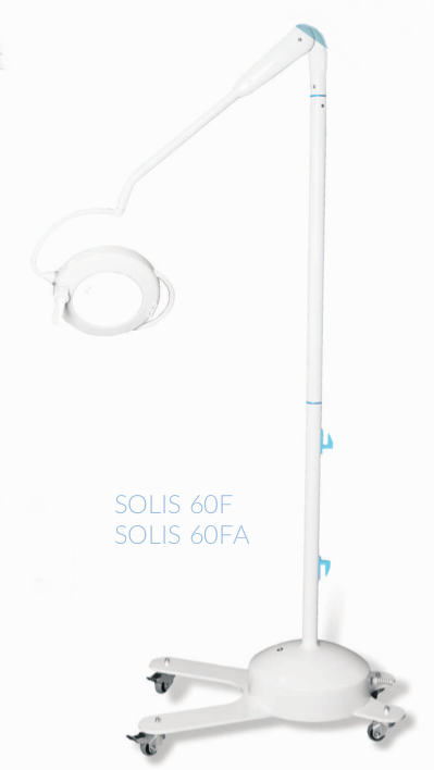 Lampa zabiegowa Solis 60 – Natężenie światła 60 tys lux. Natężenie światła z odległości 1m to 60 000 lux. Lampy zabiegowe serii SOLIS 60 są przeznaczone do stosowania jako podstawowe źródło oświetlenia w diagnostyce i przy zabiegach w gabinetach lekarskich i zabiegowych, ale także w precyzyjnych operacjach intensywnej terapii, salach dla rekonwalescencji oraz oddziałach pierwszej pomocy. Lampa SOLIS 60 posiada kolisty reflektor zaprojektowany w celu dokładnego oświetlenia pola roboczego oraz wyeliminowania cieni. Lampa ta posiada nadający się do sterylizacji uchwyt, który umożliwia ustawienie pozycji kopuły. Płaski korpus oświetlający wyposażony jest w wytrzymały poliwęglanowy ekran, który zapewnia ochronę przed możliwymi przypadkowymi uderzeniami. Budowa lampy Położenie lampy SOLIS 60 można zmienić dzięki możliwości obracania wokół czterech osi: konstrukcja zapewnia zdolność zataczania pełnego okręgu bez zatrzymań. Ramię porusza się pionowo dzięki skompensowanemu za pomocą sprężyny urządzeniu równoważącemu. Reflektor może być obracany wzdłuż osi pionowej i poziomej. Dzięki innowacyjnemu rozwiązaniu „bezdotykowego” sterowania operator może nastawić natężenie światła stosowanie do własnych potrzeb. Bezdotykowy sterownik Lampy są wyposażone w bezdotykowy sterownik pozwalający na trójstopniową regulację natężenia światła. Oprawa jest wykonana z tworzywa, posiada uchwyt sterylny, przeznaczony do manewrowania lampą. Konstrukcja lampy umożliwia czyszczenie, dezynfekcję i sterylizację ogólnie dostępnymi środkami. Kopuła charakteryzuje się brakiem widocznych śrub i innych zagłębień mogących utrudniać jej mycie i dezynfekcję. Wiele konfiguracji lampy Lampy Solis 60 występują w następujących konfiguracjach: Solis 60F – wersja mobilna Solis 60C – wersja sufitowa Solis 60W – wersja ścienna Solis 60/60F – wersja mobilna podwójna Solis 60/60C – wersja sufitowa podwójna Solis 60/60W – wersja ścienna podwójna Solis 60FA – wersja mobilna z awaryjnym zasilaniem akumulatorowym Parametry techniczne lampy Solis 60: