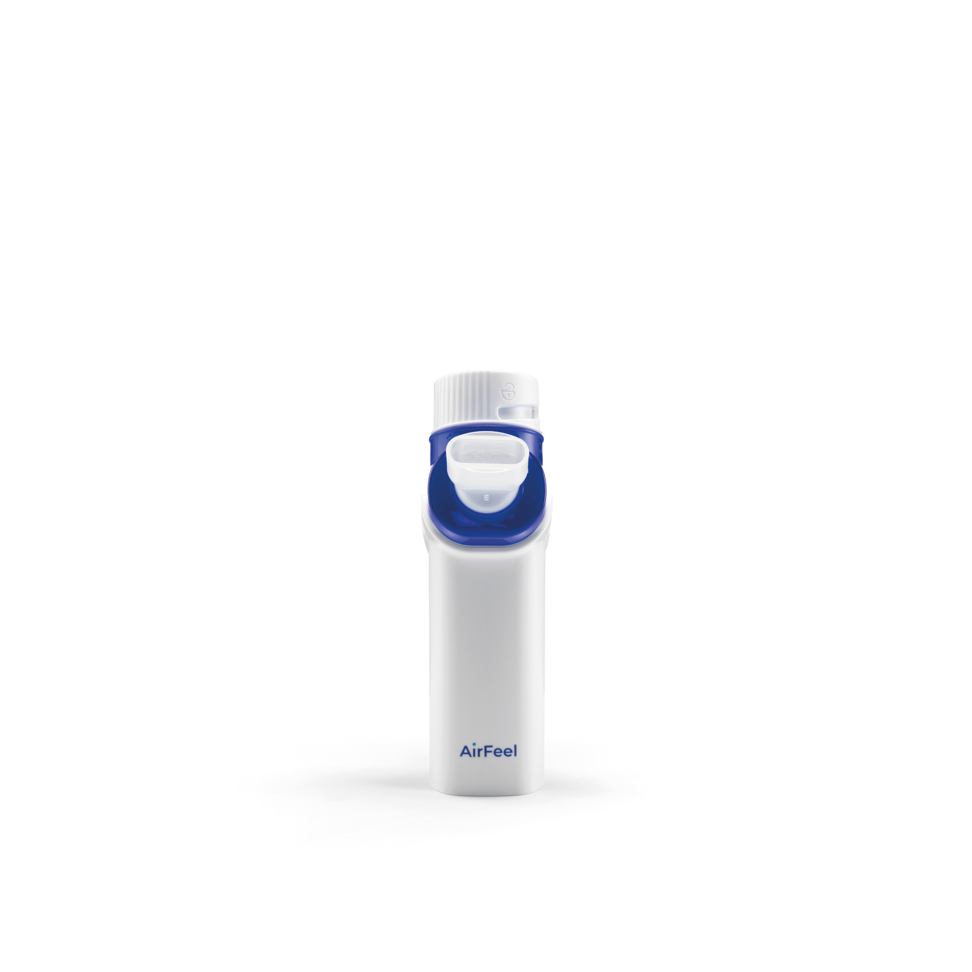 AirFeel trenażer oddechu z dwoma trybami: PEP i O-PEP Flaem AirFeel to zaawansowany trenażer oddechu oraz urządzenie rehabilitacyjne zaprojektowane do poprawy funkcji układu oddechowego. Wykorzystując innowacyjny mechanizm z wykorzystaniem stalowej kulki, urządzenie skutecznie oczyszcza płuca poprzez stymulację drzewa oskrzelowego. Posiadając dwa tryby pracy – O-PEP i PEP – Flaem AirFeel umożliwia elastyczną terapię: O-PEP dostarcza dynamicznych oscylacji ciśnienia dla ułatwienia oddychania, natomiast PEP (Positive Expiratory Pressure) wspomaga otwarcie dróg oddechowych i zwiększenie objętości płuc. Efektywna terapia wydechowa z użyciem urządzenia PEP Po obróceniu nasadki do pozycji “zamkniętej” blokuje ona wewnętrzną kulkę i tłoczy powietrze tylko przez wybrany otwór wskazany przez fizjoterapeutę. Jako urządzenie z dodatnim ciśnieniem wydechowym (PEP), AirFeel zapewnia przeciwciśnienie w drogach oddechowych podczas wydechu. Może to poprawić oczyszczanie poprzez gromadzenie gazu za śluzem poprzez wentylację poboczną i tymczasowe zwiększenie funkcjonalnej pojemności resztkowej. O-PEP: Złagodzenie Zatorów i Poprawa Drożności Drogowych Płucnych Po obróceniu nasadki do pozycji “otwartej” nakrętkę pierścieniową należy obrócić, aby ustawić obciążenie oporowe w pozycji Ø, wykonując terapię O-PEP. OPEP to połączenie terapii PEP i oscylacji: PEP działa poprzez obwodowe przesunięcie punktu równego ciśnienia, aby zmaksymalizować przepływ powietrza i zapobiec dynamicznemu zapadaniu się dróg oddechowych. Wydłuża to czas wydechu i wentylację pęcherzyków płucnych, ułatwiając wymianę gazów. Oscylacje zmniejszają lepkosprężyste właściwości śluzu, mobilizując śluz w drogach oddechowych, umożliwiając krótkie serie zwiększonego przepływu powietrza wydechowego, co pomaga mobilizować wydzieliny w drogach oddechowych. Możliwość dokupienia inhalatora Flaem i nebulizatora RF7. Dodatkowo, dzięki opcji wibronebulizacji po podłączeniu do kompresora, urządzenie można efektywnie wykorzystać do inhalacji leków. Łatwość czyszczenia Produkt można całkowicie zdemontować, tym samym ułatwiając dokładne czyszczenie jego komponentów, które można czyścić w autoklawie. Przenośny i ergonomiczny Wyposażony w łatwy do trzymania uchwyt, który może zostać zdjęty i użyty do przechowywania różnych elementów produktu, znacząco ułatwiając transport. Łatwa regulacja Za pomocą nakrętki pierścieniowej można wybrać 5 różnych otworów PEP i odpowiednio zmodyfikować obciążenie oddechowe. W zestawie:AirFlaem, moduł PEP, ustnik, rękojeść, klips do nosa, etui. Możliwość dokupienia manometru. Dzięki dodatkowemu manometrowi terapeuta może zalecić najlepsze ustawienia leczenia, podczas gdy pacjent może sprawdzić prawidłowy postęp swojej terapii.