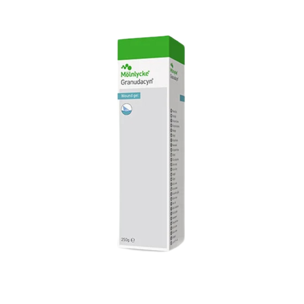 Granudacyn Żel i roztwór do irygacji ran Granudacyn® to roztwór do irygacji do oczyszczania i nawilżania ostrych, przewlekłych i zanieczyszczonych ran, a także oparzeń pierwszego i drugiego stopnia. Kwas podchlorawy (HOCl) zapewnia bezpieczną konserwację i sprawia, że Granudacyn jest niezawodnym rozwiązaniem do irygacji ran. Granudacyn można stosować do płukania następujących rodzajów ran: Wszelkie rany przewlekłe o dowolnej głębokości, takie jak owrzodzenie stopy cukrzycowej, odleżyna, żylne owrzodzenie goleni itp. Wszelkie rany ostre, skaleczenia, po ugryzieniu, szarpane, otarcia Rany operacyjne (śródoperacyjne i pooperacyjne) Rany na chrząstkach, ścięgnach, więzadłach i/lub kościach Owrzodzenie popromienne Przetoki i ropnie Ubytki takie jak ucho, nos, gardło Krytycznie skolonizowane rany Urazy tkanek miękkich Granudacyn można również stosować do nawilżania opatrunków na rany. Granudacyn jest odpowiedni do stosowania przez wielu pacjentów do 90 dni (żel) i 60 dni (roztwór) po otwarciu. Aby zapewnić bezpieczne stosowanie po otwarciu, Granudacyn zawiera środek konserwujący, który naturalnie występuje w organizmie: kwas podchlorawy 1. Kwas podchlorawy zapobiega również proliferacji bakterii Gram+ i Gram-, w tym MRSA, ORSA, VRSA, VRE, wirusów, grzybów i zarodników. Mechanicznie oczyszcza ranę Wolne od zarazków i neutralne pH Nie cytotoksyczny ani drażniący; wolny od metali ciężkich Hipotoniczny promujący osmolizę i pękanie komórek Redukuje nieprzyjemny zapach z ran.