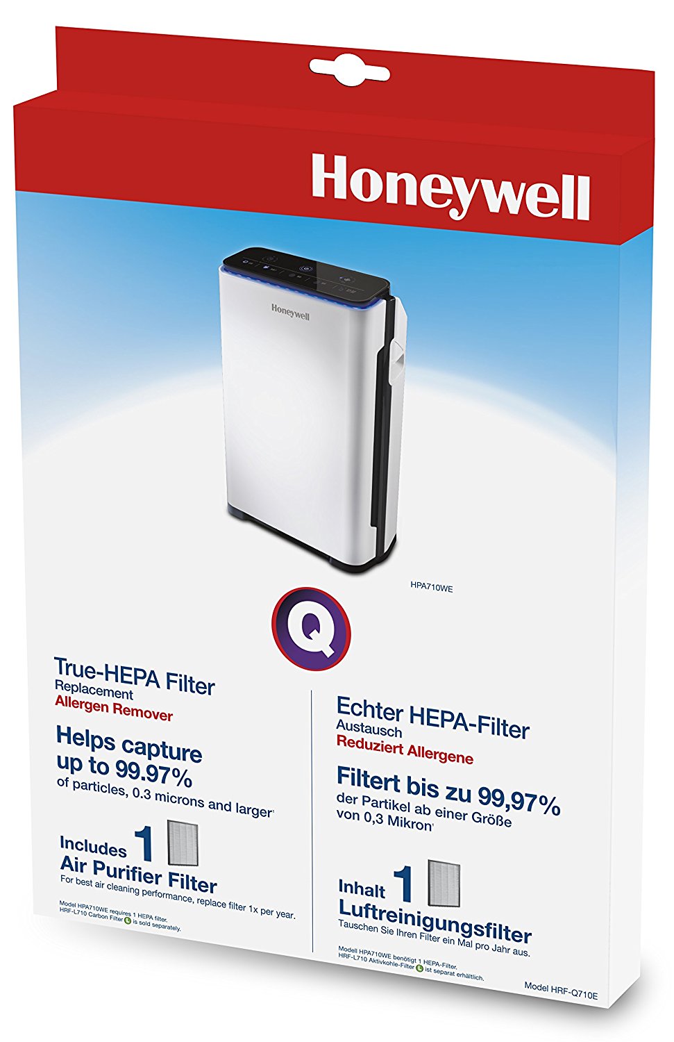 Filtr true HEPA HRD-Q710E do oczyszczacza Honeywell HPA710 Zestaw zawiera 1 filtr. Żywotność filtra: 12 miesięcy. Kompatybilny z oczyszczaczem powietrza Honeywell HPA710WE. Przechwytuje do 99,97% cząstek zawieszonych w powietrzu (> 0,3 mikrona). Standard doskonałości dla osób z alergiami, katarem siennym, astmą.