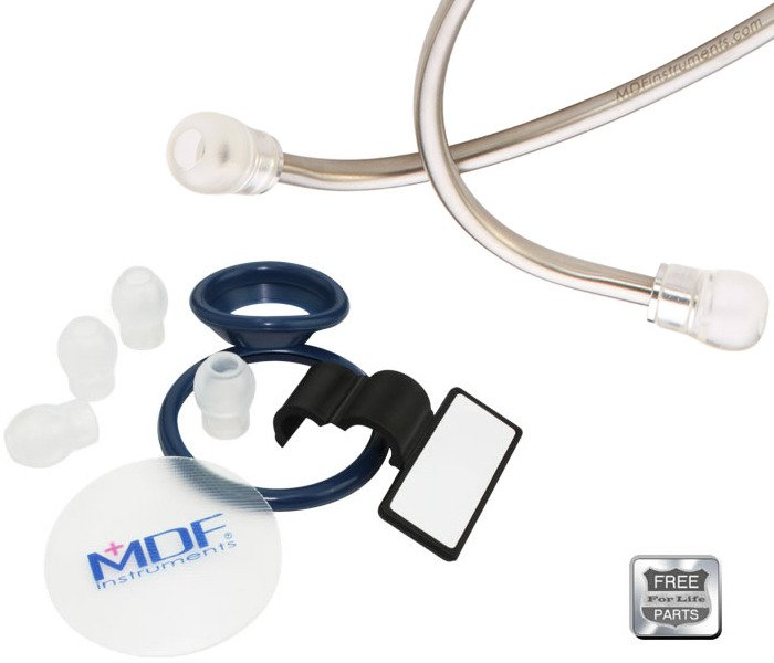 Stetoskop MDF 747 Stetoskop dedykowany dla wszystkich pracowników medycznych. Lira umieszczona poza światłem przewodu. Regulowana lira została wykonana z chromowanego mosiądzu i umieszczona poza światłem przewodu. Dwustronna głowica wykonana z anodowanego aluminium i chromowanego mosiądzu, zapewnia dobre parametry akustyczne i umożliwia tradycyjne metody osłuchiwania za pośrednictwem membrany i lejka. Membrana jest wykonana z czułego włókna wzmacniającego dźwięk. Szczelność membrany zapewniona jest dzięki pierścieniowi podtrzymującemu (Diaphragm Retaining Ring), który tworzy wzmocnienie i wysoką częstotliwość transmisji tonów serca i płuc o częstotliwościach od 100 to 1000 Hz. Duży lejek z nieziębiącym pierścieniem zapewnia wzmocnienie akustyczne i izolację dla dźwięków o niskiej częstotliwości. Membrana jest wypukła z pierścieniem podtrzymującym, wykonanym z nieziębiącego tworzywa PVC.
