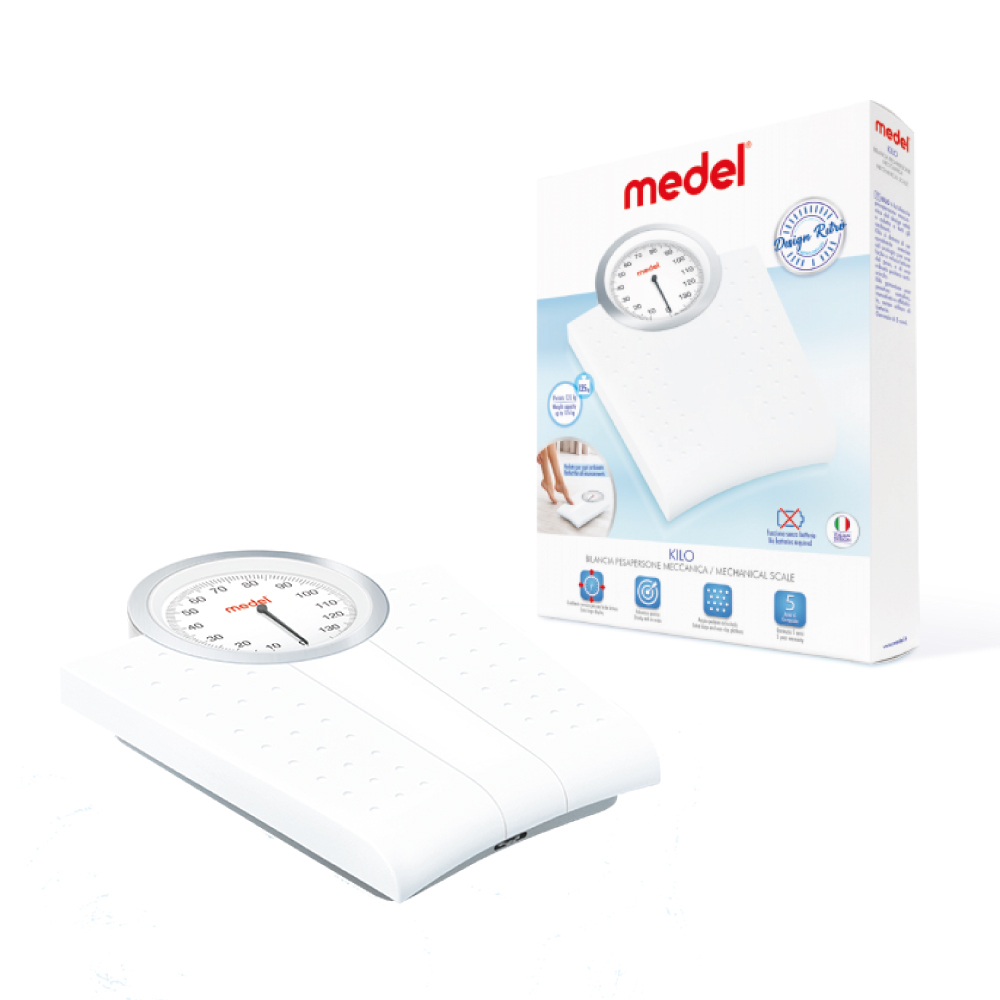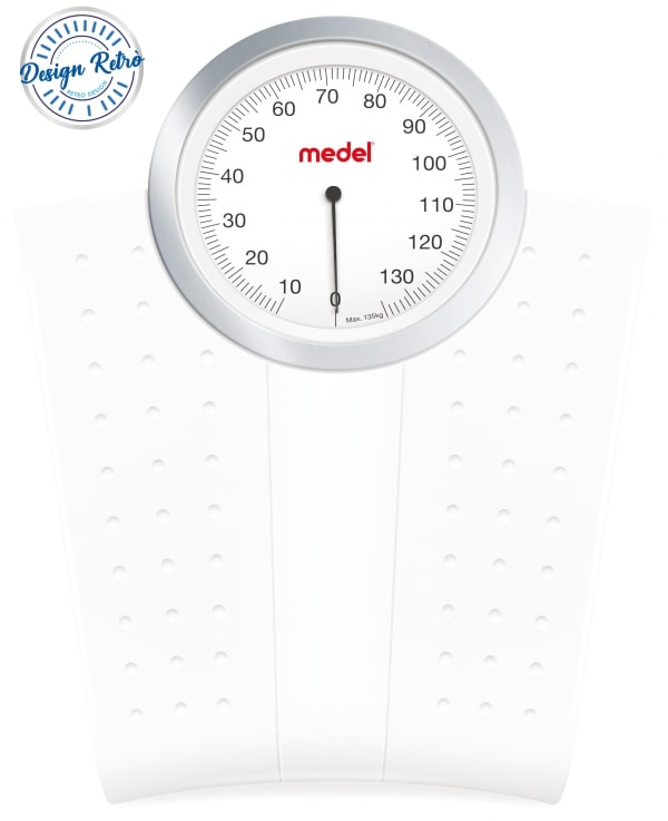 Waga mechaniczna w stylu retro Waga mechaniczna z bardzo dużym wyświetlaczem nie wymaga baterii KILO to waga mechaniczna w stylu retro KILO jest wyposażony w bardzo duży wyświetlacz ułatwiający czytanie i solidną antypoślizgową platformę. Z KILO by Medel masz pewność precyzyjnego pomiaru bez użycia baterii. Gwarancja 5 lat. Bardzo duży wyświetlacz. Solidne i dokładne. Bardzo duża i antypoślizgowa platforma. Wyświetlacz: 150 mm. Nie wymaga baterii. WŁAŚCIWOŚCI TECHNICZNE Maksymalne obciążenie 135 kg / 330 funtówPodziałka 100 g / 0,2 funtaBaterie – nie wymaganeRozmiar 43 x 34 x 5,5 cm, wyświetlacz: Ø 150 mm