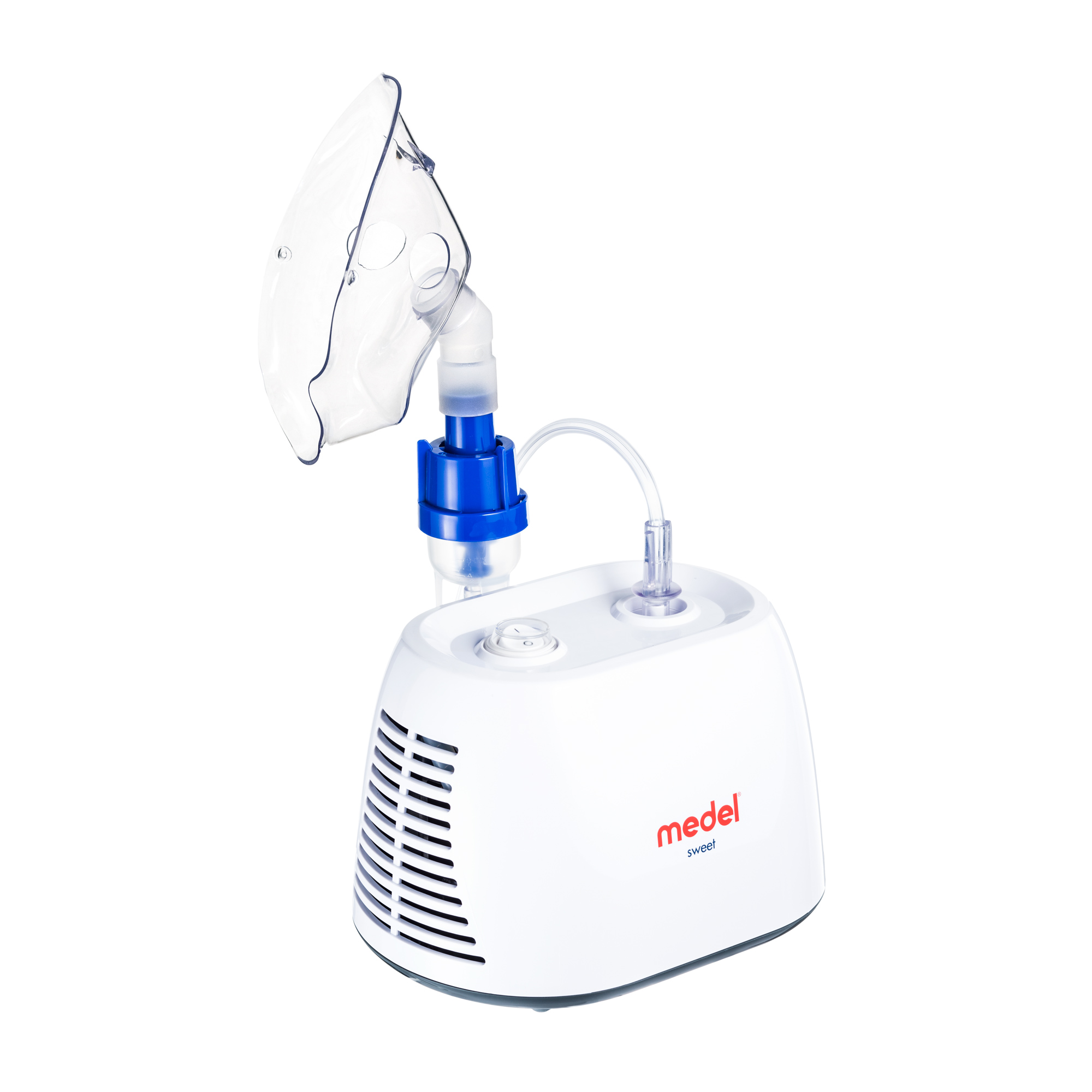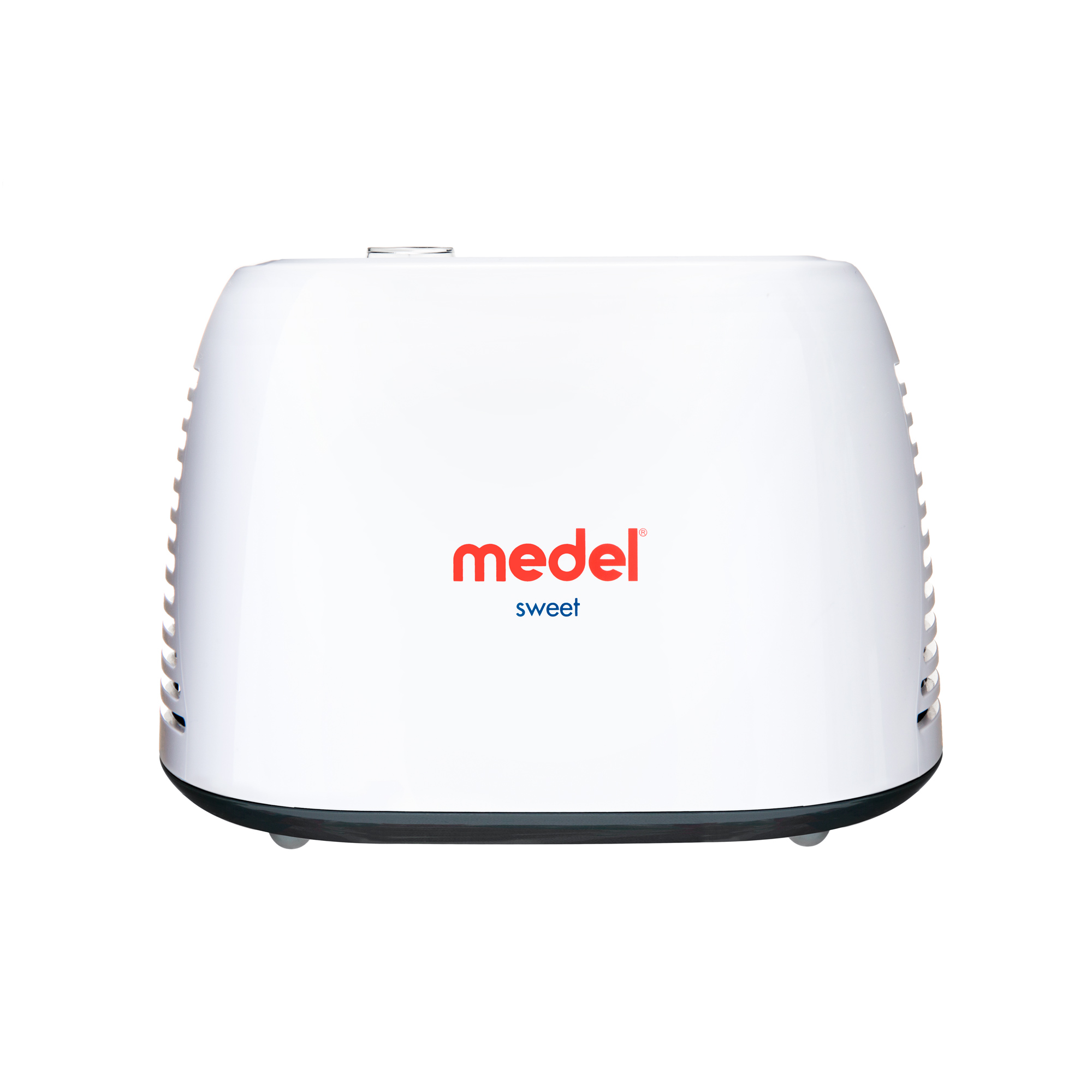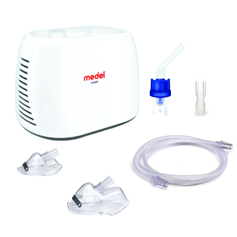 Inhalacja z soli i nebulizacja z lekarstwami… do obu użyjesz Medel Sweet Medel Sweet jest nowocześniejszy i bardziej kompaktowy. Sweet to nowy inhalator firmy Medel o innowacyjnej konstrukcji z bardziej delikatną i kompaktową obudową. Medel Sweet to szybki i łatwy w użyciu system do terapii aerozolowej, idealny do użytku domowego, odpowiedni dla całej rodziny. W zestawie z wszystkimi niezbędnymi akcesoriami do nebulizacji u dorosłych i dzieci. Urządzenie medyczne klasy Ila. Inhalacja na zatoki dla całej rodziny Inhalator Medel Sweet posiada kompaktowy design, ultracichy kompresor oraz zestaw akcesoriów niezbędnych do przeprowadzenia inhalacji (w tym końcówkę do nosa). Nebulizator Medel Jet Basic (Evo) umieszczony jest na zewnątrz obudowy inhalatora, dzięki temu unika się konieczności otwierania i zamykania urządzenia. Nebulizacja na kaszel w kilka minut Nebulizacja odbywa się w krótkim czasie, akceptowalnym przez najbardziej niecierpliwych dorosłych i dzieci, 2 ml lekarstwa zostaje zaaplikowane w czasie 5 minut. Cały proces przeprowadzany przez ustnik lub klasyczną maseczkę Medel, nie wymaga wysiłku, wystarczy spokojnie oddychać a maska szczelnie zakrywa usta i nos a lek w postaci aerozolu przedostaje się do górnych i dolnych dróg oddechowych. Nebulizator dla dzieci i dla dorosłych Szybki i wydajny nebulizator MedelJet Basic. Nebulizator czyli niewielkich rozmiarów pojemnik, do którego wlewany jest lek lub jego roztwór. W Medel Jet Basic (Evo) minimalna ilość leku wynosi 2 ml a maksymalna aż 8 ml. Cząsteczka otrzymywana z rozpylonego roztworu będzie wielkości 3,16 μm (MMAD). Dla osoby inhalowanej oznacza to, iż lekarstwo wchłonie się najlepiej w górnych drogach oddechowych, tchawicy, oskrzelach i oskrzelikach małych. Frakcja respirabilna tj. przyswajalność cząsteczek w postaci aerozolu w drogach oddechowych przy zastosowaniu nebulizatora Medel Jet Basic (Evo) wynosi 71,2 % co świadczy o wysokiej skuteczności inhalacji. Dzięki efektowi Venturiego powietrze (2) jest pobierane z górnej części nebulizatora (1) przedostaje się przez sprężarkę (3), zwiększając w ten sposób prędkość nebulizacji i skracając czas procesu. (4) Pozostała objętość lekarstwa jest znacznie zmniejszona dzięki specjalnej konstrukcji nebulizatora. Medel Sweet ułatwia nebulizowanie dzieci dzięki cichej pracy- 52 dB W inhalatorze Medel Sweet zastosowano system wyciszania dźwięku kompresora, umieszczono w nim najnowszej generacji konstrukcję z trzema łożyskami kulkowymi i dwoma zintegrowanymi tłumikami. Domownicy korzystający z inhalatora Medel Sweet będą słyszeli 52 dB czyli tylko cichy dźwięk kompresora oraz wszelkie inne odgłosy w otoczeniu. Inhalowane dziecko lub maluch przebywający w pobliżu włączonego Medel Sweet z łatwością zaakceptuje formę pracy inhalatora. Medel Sweet jest łatwy i uniwersalny w użyciu Można stosować dla: górnych dróg oddechowych: przewlekłych stanów zapalnych i alergicznych nosa, gardła i krtani w tym szczególnie nawracającego zapalenie zatok przynosowych. Płuca i oskrzela: przewlekłe i nawracające zapalenia oskrzeli, astma oskrzelowa, stany po zapaleniach płuc. Leki: Budesonid, Pulmicort, Flixotide, Berodual, sól fizjologiczna. Pacjent: dzieci, dorośli, senior, podeszły wiek, niemowlęta (z dodatkową maską). Kompletny zestaw do nebulizacji w skład którego wchodzą: Inhalator wyposażony w specjalny wieszak na nebulizator; Przewód powietrzny; Klasyczna maska dla dzieci i klasyczna maska dla dorosłych- wykonane z elastycznego tworzywa by dopasować się do kształtu twarzy. W masce wycięte są otwory bezpieczeństwa, ułatwiające oddychanie. W górnej części maski umieszczono metalowy element, który dopasowuje ją do nosa. Na bokach maski umieszczono otwory mocujące gumkę, by maska przylegała do twarzy i była szczelna. Ustnik; Końcówka do nosa; 5 zapasowych filtrów powietrza; Nebulizator MedelJet Basic- gwarantuje skuteczność, szybkość i oszczędność leku; Saszetka na akcesoria- ułatwia przechowywanie, po inhalacji i umyciu akcesoriów możemy je schować do saszetki co zapobiegnie zakurzeniu się przewodu, maseczek i nebulizatora. Gwarancja 5 lat.