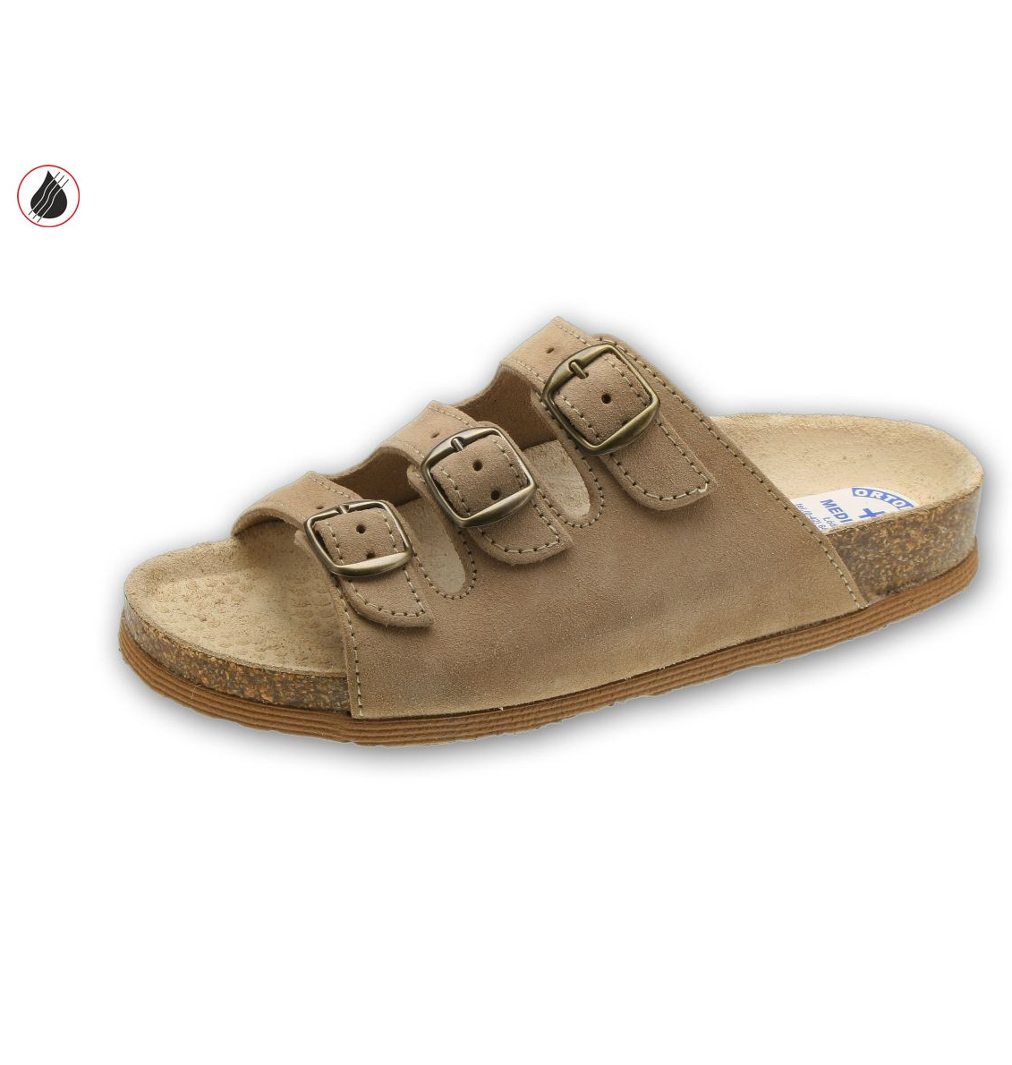 Sandały damskie – welurowe Obuwie damskie i męskie na spodach przeciwpoślizgowych i wkładach korkowo-gumowych z pełnym profilem ortopedycznym. Wyściółka i cholewka skórzana, możliwość regulacji tęgości.