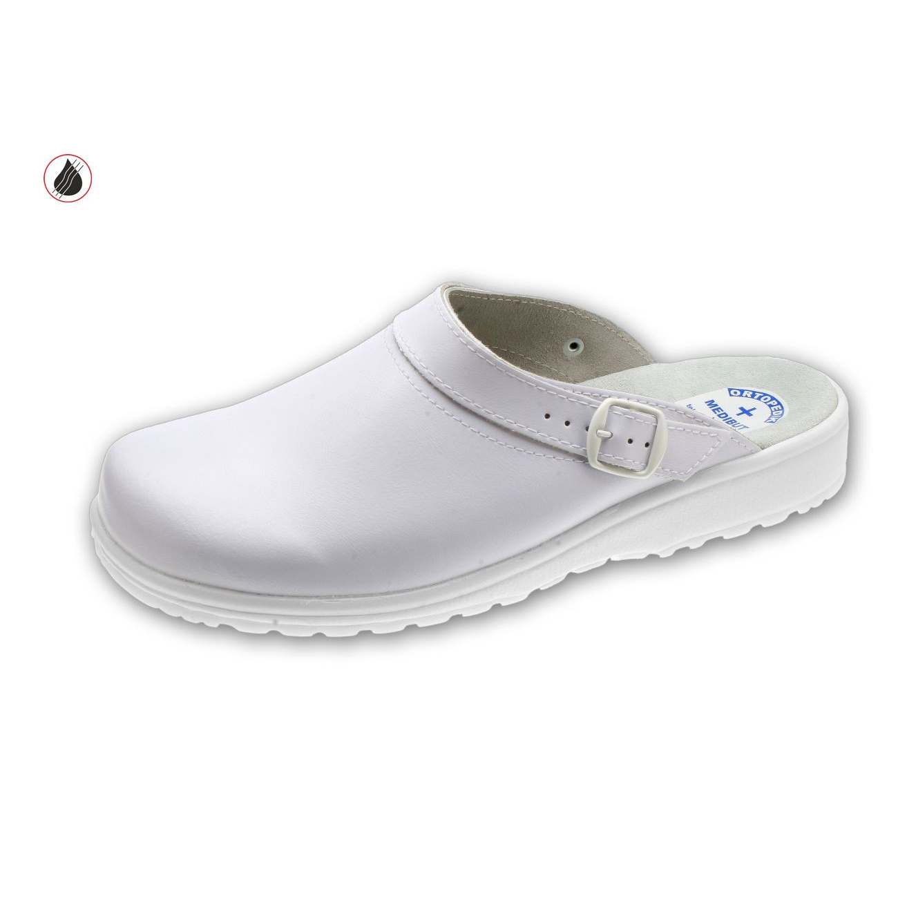Obuwie damskie i męskie na spodach przeciwpoślizgowych z profilem ortopedycznym, cholewką i wyściółką skórzaną. Cholewka gładka, pasek dwufunkcyjny przekładany na piętę