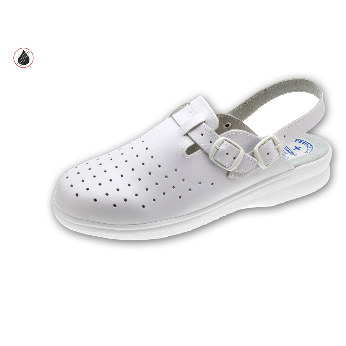 Obuwie męskie na spodach przeciwpoślizgowych z profilem ortopedycznym. Wyściółka i cholewka skórzana, możliwość regulacji tęgości. Pasek na piętę, cholewka z perforacją.