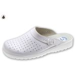 Obuwie damskie i męskie na spodach przeciwpoślizgowych z profilem ortopedycznym, cholewką i wyściółką skórzaną. Cholewka z perforacją, pasek dwu funkcyjny przekładany na piętę