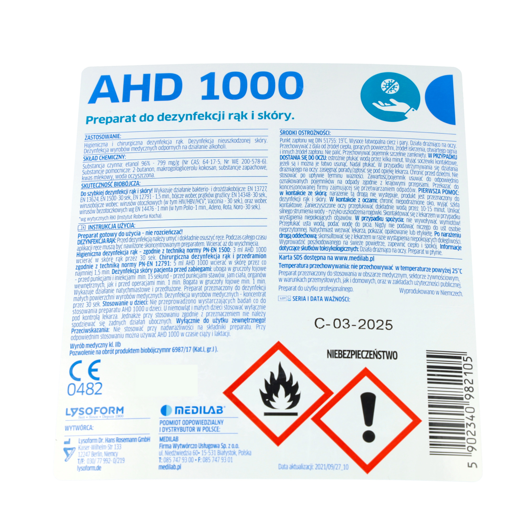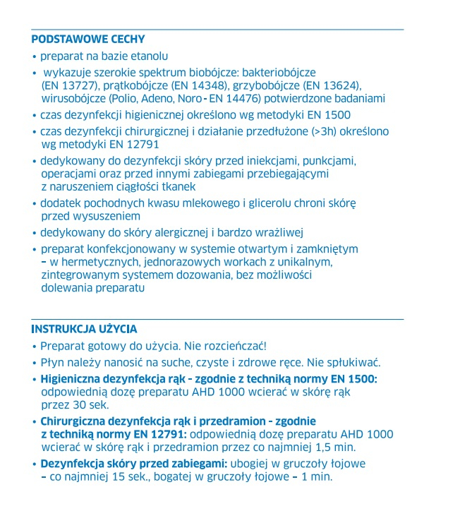 Alkoholowy płyn do dezynfekcji rąk. przeznaczony do dezynfekcji rąk przed zabiegami przebiegającymi z naruszeniem ciągłości tkanek posiada szerokie spektrum biobójcze wobec bakterii, prątków, grzybów i wirusów – inaktywacja wirusa Polio w 1 minutę! Preparat do użytku profesjonalnego. Gotowy do użycia – nie rozcieńczać. SPOSÓB UŻYCIA: Higieniczna dezynfekcja rąk – zgodnie z techniką normy EN 1500: Płyn należy aplikować na suche, czyste i zdrowe ręce.Nanieść 3 ml preparatu w zagłębienie dłoni.Wcierać w skórę rąk przez 30 sekund.Nie spłukiwać, pozostawić do wyschnięcia.Chirurgiczna dezynfekcja rąk i przedramion zgodnie z techniką normy EN 12791: Płyn należy aplikować na suche, czyste i zdrowe ręce.Nanieść 5 ml preparatu w zagłębienie dłoni.Wcierać w skórę rąk i przedramion przez co najmniej 1,5 minuty.Nie spłukiwać, pozostawić do wyschnięcia.Dezynfekcja skóry ubogiej w gruczoły łojowe przed zabiegami: Skórę zwilżyć preparatem używając bezpośrednio atomizera lub przy pomocy jałowego, nasączonego gazika.Odczekać wymagany czas: przed punkcjami i iniekcjami – co najmniej 15 s; przed punkcjami stawów, jam ciała, organów wewnętrznych i operacjami – co najmniej 1 min.Nie wycierać, pozostawić do wyschnięcia.Dezynfekcja skóry bogatej w gruczoły łojowe przed zabiegami: Skórę zwilżyć preparatem używając bezpośrednio atomizera lub przy pomocy jałowego, nasączonego gazika.Odczekać wymagany czas – co najmniej 1 min.Nie wycierać, pozostawić do wyschnięcia. SKŁAD CHEMICZNY etanol – 79,9% (799 mg/g ), substancje nawilżające, zapachowe, woda SKUTECZNOŚĆ BIOBÓJCZA Preparat wykazuje potwierdzone badaniami działanie: bakteriobójcze, prątkobójcze, grzybobójcze – 30 sek. oraz wirusobójcze . Dodatkowe działanie wobec wirusów: HIV, HBV, HCV (BVDV), SARS-CoV-2 (Vaccinia), HSV, A h2N1, Rota – 30 sek. OPAKOWANIA AHD 1000: butelka – 250 ml z atomizerem AHD 1000: butelka – 500 ml AHD 1000: worek – 700 ml AHD 1000: butelka – 1 L AHD 1000: kanister – 5 L Produktów biobójczych należy używać z zachowaniem środków ostrożności. Przed każdym użyciem należy przeczytać etykietę i informacje dotyczące produktu. Numer pozwolenia na obrót: 6987/17 z dnia 16.05.2017