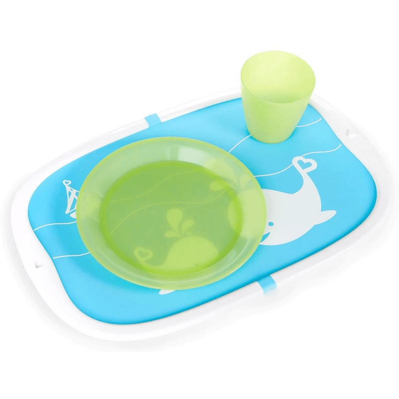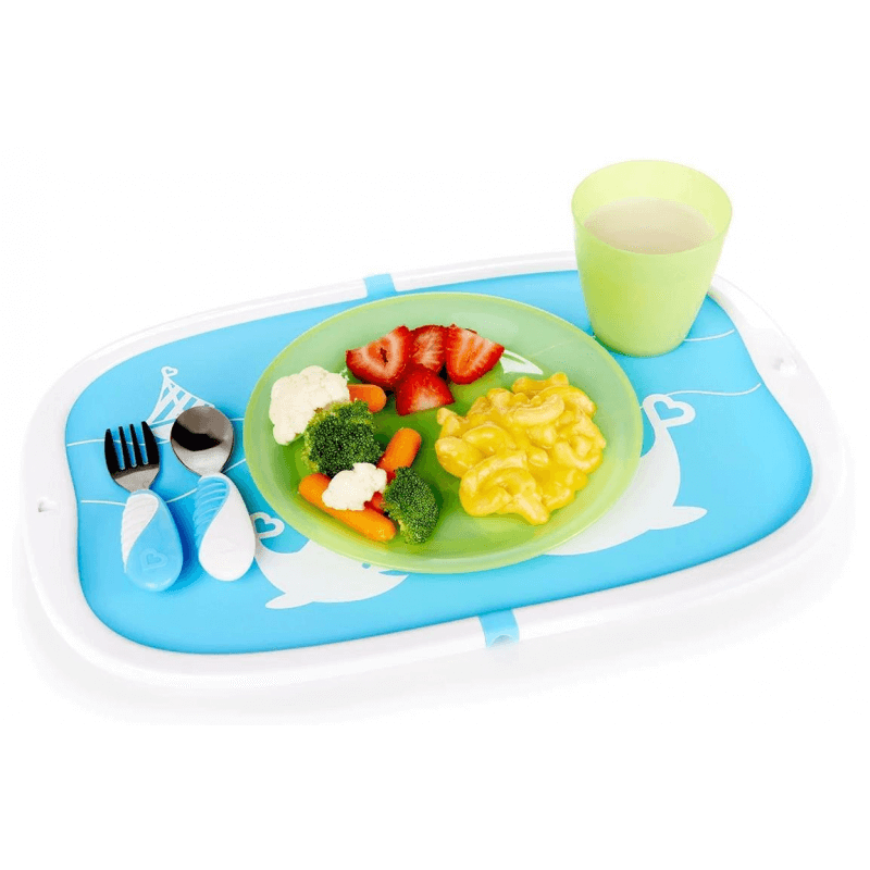 Składana podkładka do jedzenia Munchkin Go – niebieska Nietoksyczna składana silikonowa podkładka Plastikowa rama pomaga utrzymać bałagan na macie Składa się i zatrzaskuje, aby przenosić okruchy do zlewu, bezproblemowy posiłek Spójrzmy prawdzie w oczy – dzieci i rozsypywanie jedzenia idą ręka w rękę, ale z pewnością nie muszą wymykać się spod kontroli. Przenośna podkładka silikonowa Munchkina ma super mocną przyczepność, dzięki czemu jest bezpiecznie przymocowana do stołu, podczas gdy maluchspokojnie je posiłki. Maluchy uwielbiają zabawne kształty zwierząt, a rodzice uwielbiają plastikową krawędź, która utrzymuje okruchy i klopsiki na macie zamiast na podłodze. Gdy zabawa się skończy, a brzuchy będą pełne, możesz ją łatwo złożyć, zatrzasnąć i wrzucić do kuchni, aby szybko i łatwo wyczyścić ją w zmywarce lub zlewie. Doskonale nadaje się do posiłków w domu, ale także świetnie sprawdza się w podróży, ponieważ utrzymuje jedzenie i ręce z dala od brudnych stołów. Pora posiłku stała się o wiele łatwiejsza do przełknięcia.