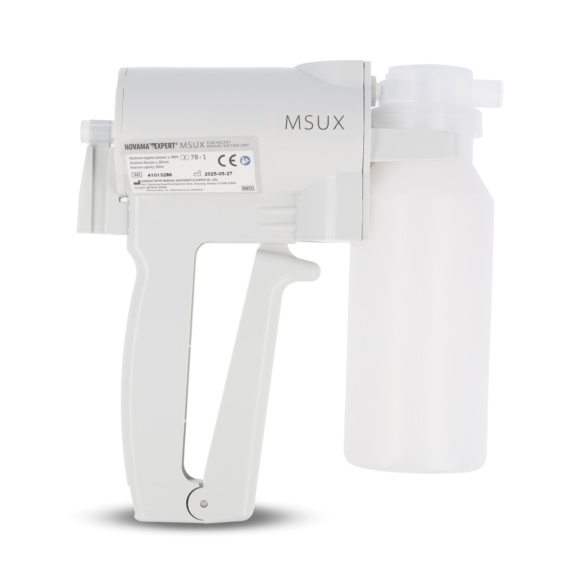 Novama Expert​MSUX​Manualny ssak typu pistoletowego  Cechy​- Maksymalna siła ssania 40 kPa​- Wydajność przepływu powietrza 20 l/min​- Przezroczysty pojemnik na płyn 200 ml ​- 3 różne rurki ssące​- Działa bez zasilania​- Etui w zestawie​​Parametry techniczne​Maksymalna wartość podciśnienia: ≥ 40 kPa​Maksymalne natężenie przepływu: ≥ 20 l/min​Pojemność zbiornika: 200 ml​Waga: 202 g​Rozmiar: 17cm x 5cm x 18cm​​Zawartość opakowania​1. Ssak ręczny MSUX​2. Rurka ssąca 8,0 mm​3. Rurka do odsysania plwociny 2,67 mm (F8)​4. Rurka do odsysania plwociny 4,0 mm (F12)​5. Etui​6. Instrukcja obsługi