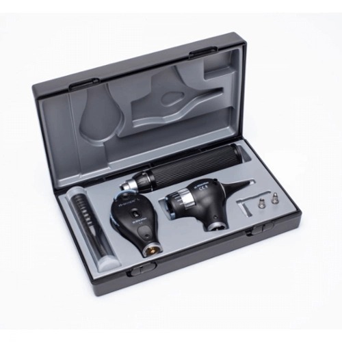 Otoskop EliteVue LED 3,5V, rękojeść akumulatorowa typ C, w twardym futerale Otoskop makro EliteVue to nasz topowy, najwyższej klasy otoskop. Otoskop oferuje 5-krotne powiększenie, pokrętło do regulacji głębokości ogniskowej, funkcję wysuwania wzierników oraz możliwość wyboru zasilania bateryjnego. Dostępne opcje ładowania i zasilania to baterie alkaliczne typu C, ładowarka USB z bateriami litowo-jonowymi lub podstawka do ładowania akumulatorów litowo-jonowych. Uchwyty w rozmiarze C są solidne i wytrzymałe. Kołnierz na rękojeści posiada przyciski +/-, które umożliwiają włączanie otoskopu oraz rozjaśnianie lub przyciemnianie według upodobań. Otoskop jest również wyposażony w funkcję automatycznego wyłączania po 180 sekundach, co oszczędza baterię i żarówkę. Dostępne są dwa rodzaje oświetlenia: LED lub ksenonowe. EliteVue oferuje 5-krotne powiększenie i średnicę pola widzenia 11 mm przy odległości około 20 mm. Dwukrotnie większe pole widzenia zapewnia pełny obraz przewodu słuchowego i błony bębenkowej, eliminując konieczność panoramowania otoskopu, co wspomaga skuteczniejszą diagnostykę. Szczegóły EliteVue Oświetlenie gardła poprzez pierścień światłowodowy Wzierniki jednorazowego lub wielokrotnego użytku Port insuflacji do otoskopii pneumatycznej Komora baterii, uchwyty metalowe chromowane na czarno Domyślna pozycja ostrości (przechwytywanie) Pokrętło ostrości umożliwia dostosowanie do zmiennej długości kanału słuchowego i oczu dalekowidzących Ochrona okularów Przycisk SpecEject ® Funkcje i korzyści Posiada 5-krotne powiększenie i pokrętło ręcznego ustawiania ostrości Oferuje o 66% większe powiększenie w porównaniu ze standardowymi otoskopami Pokazuje dwukrotnie większe pole widzenia Funkcja wyrzucania wzierników w celu zmniejszenia ryzyka zakażenia krzyżowego Innowacyjne oświetlenie LED Wysokowydajne oświetlenie światłowodowe Nadaje się do oświetlenia gardła Różne opcje zasilania bateryjnego (inne warianty) Dwuletnia gwarancja 5-krotne powiększenie Układ soczewek zapewnia 5-krotne powiększenie i pole widzenia o średnicy 11 mm przy odległości około 20 mm. Lampa do EliteVue XL XL 3,5 V, 3,5 V, 720 mA, średnia żywotność 15 godz. Lampa do EliteVue LED LED 3,5 V, 3,5 V, 300 mA, średnia żywotność do 100 000 h Temperatura otoczenia od 0 °C do 40 °C Wilgotność względna 30% do 70% bez kondensacji Przechowywanie/Transport Temperatura otoczenia -10 °C do 55 °C Wilgotność względna podczas przechowywania/transportu 10% do 95% bez kondensacji Ciśnienie powietrza 800 hPa – 1100 hPa