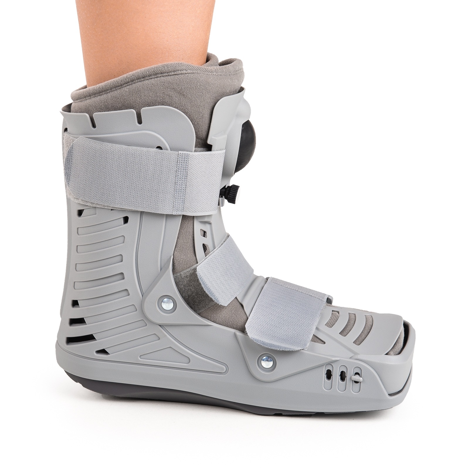 ZASTOSOWANIE: Air Walking Boot to orteza, która zapewnia świetną stabilizację i ochronę w przypadku urazów tkanek miękkich okolicy stawu skokowego, inne jej zastosowania to doleczenia stabilnych złamań okolicy stawu skokowego i śródstopia. CECHY PRODUKTU: Orteza składa się ze sztywnego, perforowanego korpusu, zapewniającego efektywną stabilizację, Korpus zapewnia swobodną cyrkulację powietrza, Orteza wyposażona jest w profilowaną podeszwę pozwalającą na chód zbliżony do fizjologicznego, Wewnętrzna wyściółka wykonana z miękkiego, oddychającego materiału, Dwie komory powietrzne zapewniają możliwość regulacji siły kompresji tkanek miękkich oraz siły stabilizacji, Orteza posiada regulowaną osłonę zapewniającą ochronę palców, Uniwersalne zaopatrzenie prawej i lewej kończyny. PRZECIWWSKAZANIA: Wyrób nie może być stosowany w przypadku wystąpienia owrzodzenia skóry lub w przypadku ran otwartych oraz niestabilnych lub otwartych złamań. ROZMIARY: Rozmiar S M L XL Wysokość (cm) 19.5 21.5 22.5 25 Wkładka 36-38 38-40 40-43 43-46 Waga (kg) 0.8 0.93 1.05 1.40