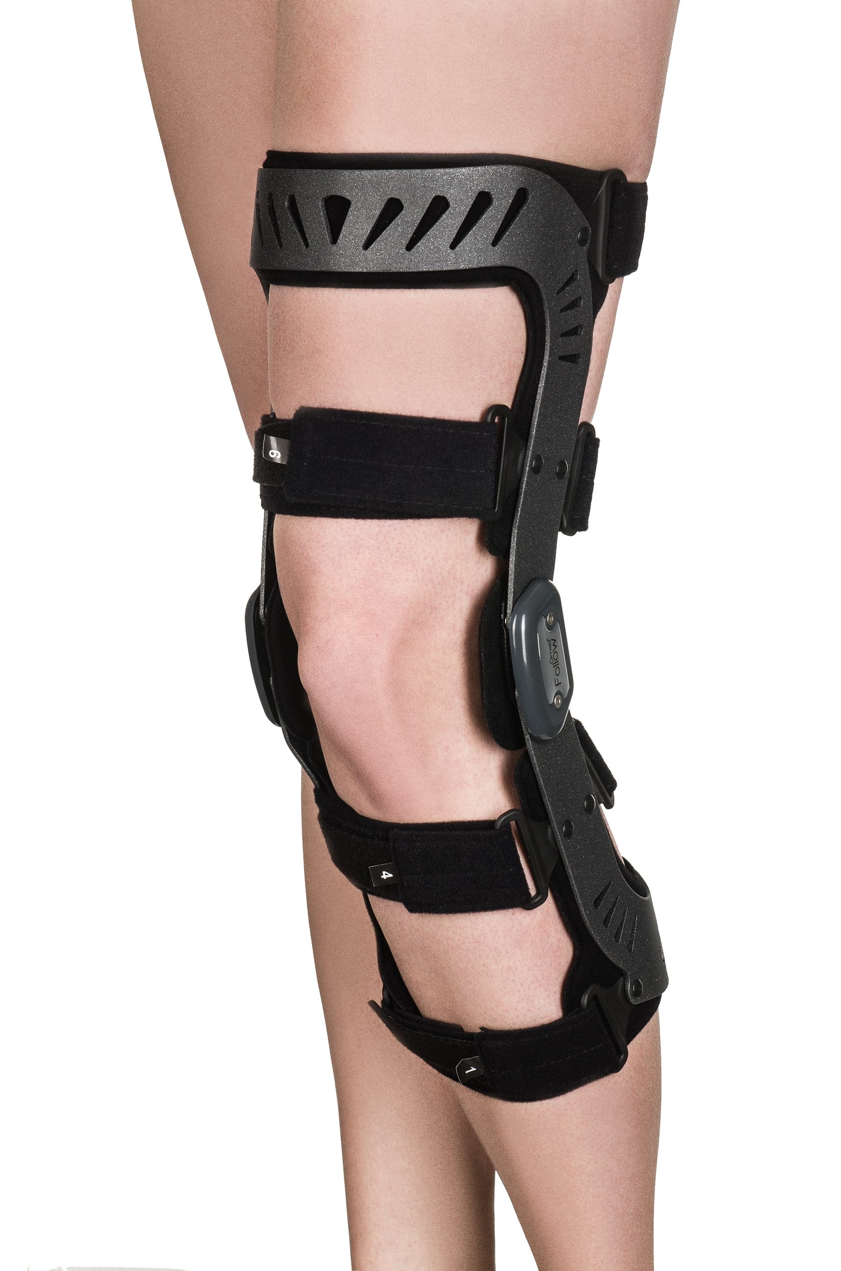 ZASTOSOWANIE: Orteza Follow przeznaczona jest dla osób z niestabilnością stawu kolanowego różnej etiologii, stosowana w przypadku uszkodzeń więzadeł ACL, PCL, MCL, LCL, odnosi skutek również w procesie rehabilitacji po zabiegach i powrocie do pełnej sprawności. CECHY PRODUKTU: specjalnie wyprofilowana lekka konstrukcja, rama wykonana z aluminium o podwyższonej wytrzymałości stosowanej w przemyśle lotniczym, opatentowany czteroosiowy zegar odzwierciedlający fizjologiczny ruch stawu kolanowego (toczenia i poślizgu), czteropunktowy system podparcia zegary pozwalające na podwójne ograniczenie zakresu ruchu wyprostu10 ̊, 20 ̊ ,30 ̊ i zgięcia 10 ̊ , 20 ̊ , 30 ̊, 45 ̊ , 60 ̊ , 90 ̊, 110 ̊ oraz unieruchomienia w 0 ̊ ruchome uchwyty pasów, orteza wykonana jest z materiałów nierdzewnych, odpornych na substancje takie jak: woda, chlor, sól, niska temperatura, wersja na prawą i lewą nogą, kolor grafitowy. ROZMIARY: Rozmiar XS S M L XL Obwód uda* (cm) 33 – 39 39 – 47 47 – 53 53 – 59 59 – 67 Obwód kolana (cm) 30 – 33 33 – 35 35 – 38 38 – 43 43 – 48 Obwód łydki** (cm) 25 – 30 30 – 35 35 – 40 40 – 47 47 – 50 * obwód mierzony 15 cm powyżej środka rzepki ** obwód mierzony 15 cm poniżej środka rzepki
