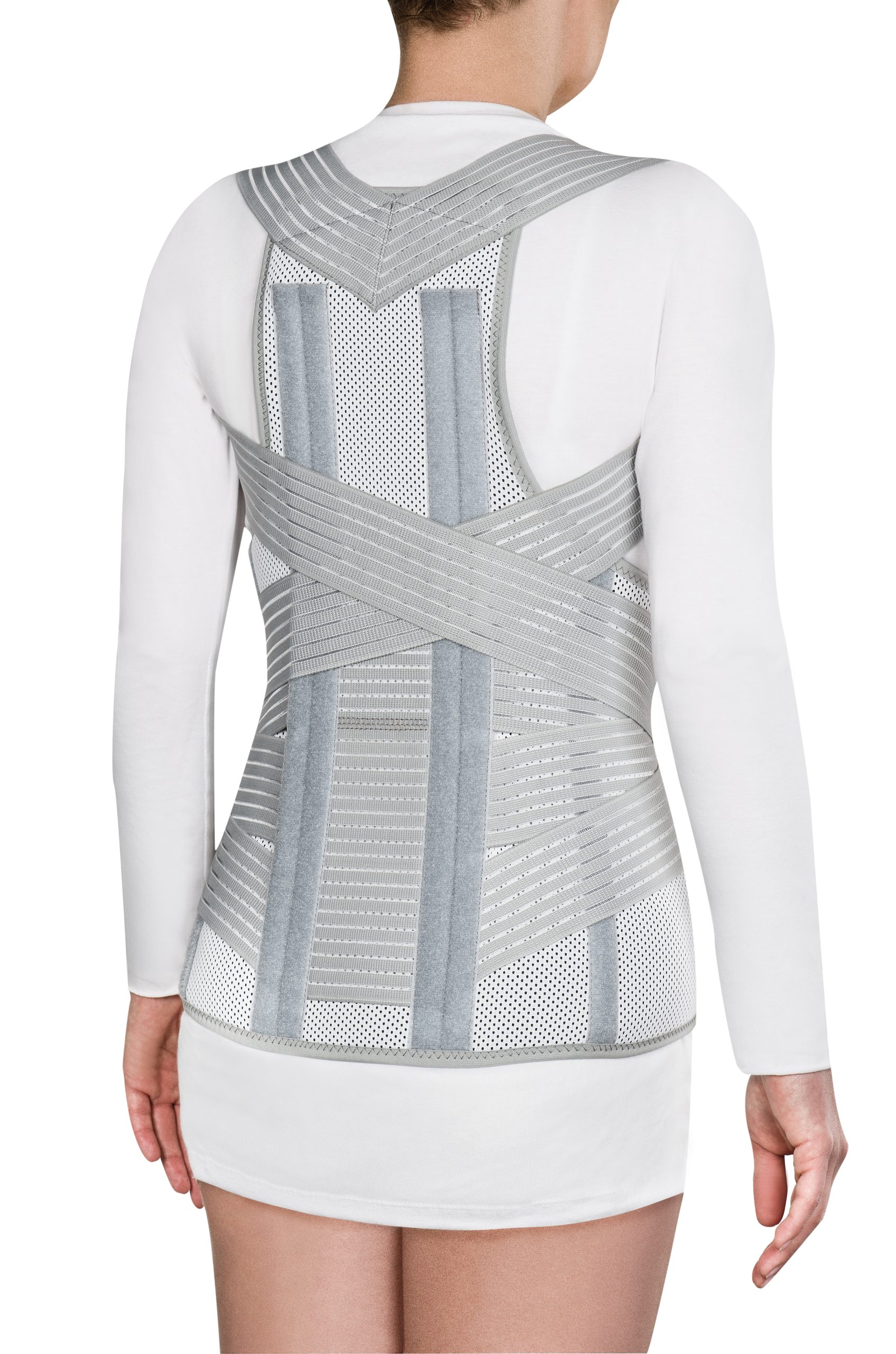 ZASTOSOWANIE: Orteza Premium TLS stosowana jest podczas wielopoziomowej dyskopatii, niestabilności kręgosłupa, choroby zwyrodnieniowa z zespołami bólowymi, dolegliwości bólowych w obszarze TLS o różnej etiologii, stabilizacji po zabiegach operacyjnych, doleczania pogorsetowego. CECHY PRODUKTU: orteza wykonana jest z elastycznej pianki laminowanej z jednej strony dzianiną siatkową z miękkich włókien poliamidowych typu Meryl oraz z drugiej strony dzianiną bawełnianą, elastyczny materiał nie ogranicza konwekcyjnego odprowadzania ciepła, odprowadza wilgoć z powierzchni skóry, cztery elastyczne stalki w części grzbietowej pozwalają na ograniczenie ruchomości i odciążenie elementów mięśniowo-więzadłowych oraz na dopasowanie się ortezy do pacjenta, dwie dodatkowe elastyczne stalki w części LS wzmacniają siłę stabilizacji tego odcinka, zastosowanie czterech tworzywowych fiszbin w części brzusznej wspomaga stabilizację odcinka lędźwiowo-krzyżowego, dodatkowe taśmy naramienne wspomagają korekcję i utrzymanie prawidłowej postawy ciała, system taśm dociągowych zapewnia możliwość regulacji siły stabilizacji, kolor jasnoszary. ROZMIARY: Rozmiar S M L XL XXL Obwód pasa (cm) 85 – 95 95 – 105 105 – 115 115 – 125 125 – 135