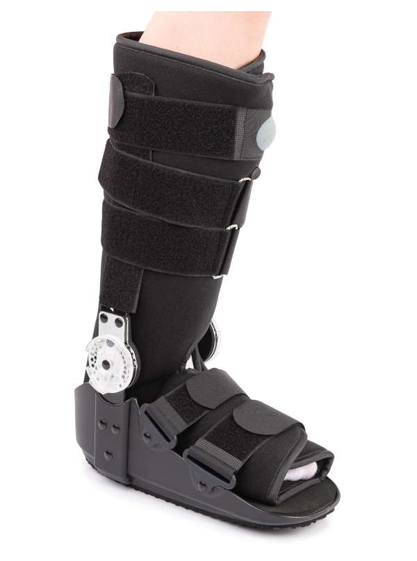 ZASTOSOWANIE: Orteza stosowana jest do stabilizacji oraz przeciwdziałania obrzękom w przypadku urazów tkanek miękkich okolicy stawu skokowego, dystalnej części goleni, skręceń stawu skokowego drugiego i trzeciego stopnia, stosowana jest również do doleczania stabilnych złamań okolicy stawu skokowego, śródstopia, unieruchomienia w wybranym zakresie terapeutycznym po zabiegach operacyjnych,po zabiegu operacyjnym na stawie palucha, podczas uszkodzenia tkanki miękkiej, ścięgna Achillesa, a także podczas ochrony i stabilizacji pourazowej okolic stopy i stawów skokowych, konieczności unieruchomienia stawów skokowych w wybranym zakresie terapeutycznym. CECHY PRODUKTU: orteza posiada miękką, pneumatyczną wyściółkę pozwalającą na regulację stopnia kompresji tkanek miękkich, produkt wyposażony jest w taśmy dociągowe z rzepów twardych, osłonięty zegar umożliwiający podwójne ograniczenie zakresu kątowego ruchu zgięcia podeszwowego i grzbietowego od 0° – 45° co 15°, stabilny i zbliżony chód do fizjologicznego umożliwia profilowana podeszwa ortezy, uniwersalne zaopatrzenie prawej i lewej kończyny, kolor: czarny. ROZMIARY: Rozmiar S M L XL Rozmiar buta 36-39 40-44 44-46 46+ Wysokość ortez: S/M – 43 cm, L/XL – 45 cm
