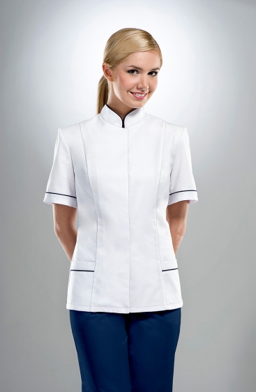 Bluza medyczna ze stójką dla kobiet Kolor biały, wykończona lamówką. Zapinana z przodu na napy, z krótkimi rękawami. Materiał: Bawełna 35%, Poliester 65% Gramatura 195g/m2