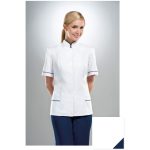 Bluza medyczna ze stójką dla kobiet Kolor biały, wykończona lamówką. Zapinana z przodu na napy, z krótkimi rękawami. Materiał: Bawełna 35%, Poliester 65% Gramatura 195g/m2