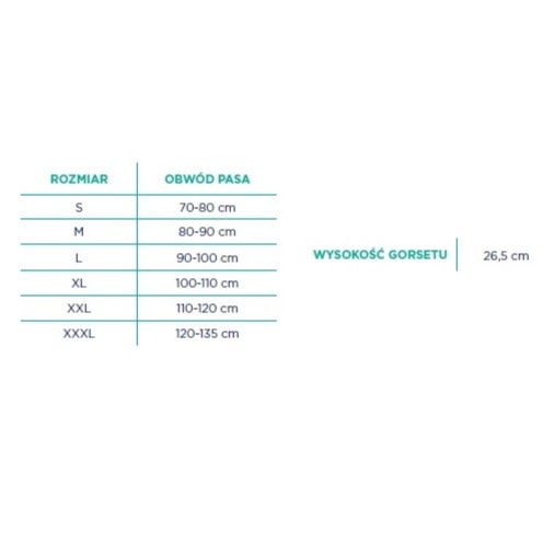 Wysoka orteza (gorset) piersiowo-lędźwiowo-krzyżowa TGO-C GLKP 707 Wysoka orteza (gorset) piersiowo-lędźwiowo-krzyżowa wykonany jest z elastycznej tkaniny kompresyjnej. Składa się z pasa zapinanego z przodu na rzep, elastycznych stalek stabilizujących kręgosłup oraz pasów dociągających umożliwiających regulację siły stabilizacji. Poprzez wykorzystanie tkaniny przestrzennej uzyskano bardzo dobrą stabilizację dopasowanie anatomiczne oraz komfort użytkowania. Wysokość jest odpowiednia dla stabilizacji odcinka piersiowo-lędźwiowo-krzyżowego kręgosłupa. Wskazania do stosowania ortezy: dyskopatia stany zapalne stawów kręgosłupa bóle przeciążeniowe zmiany zwyrodnieniowe zespoły neuropatyczne i korzeniowe stany wzmożonego, bolesnego napięcia mięśni grzbietu w leczeniu pooperacyjnym w procesie rehabilitacji pourazowej Kod produktu: TGO-C GLKP 707 Rozmiar: S – 70-80 cm M – 80-90 cm L – 90-100 cm XL – 100-110 cm XXL – 100-120 cm