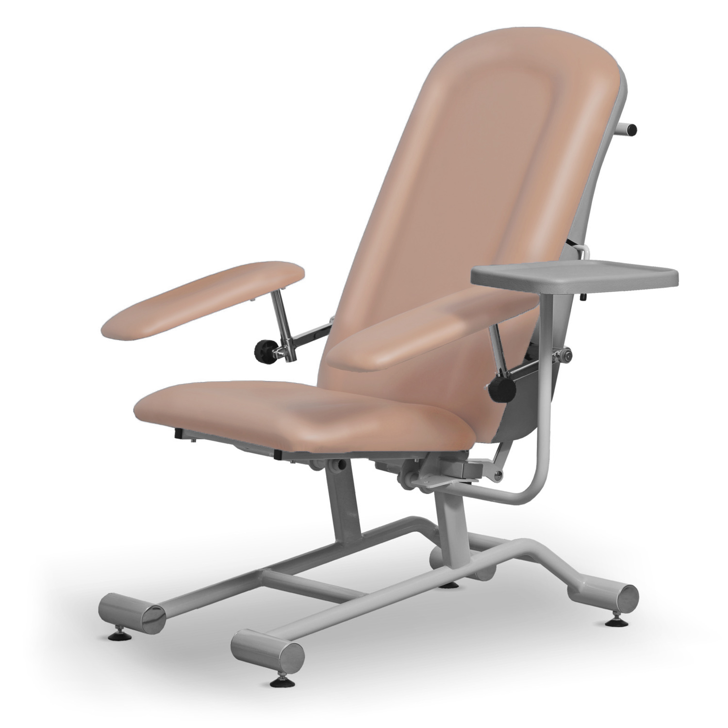 Multifunkcyjny fotel zabiegowy FoZa Basic Multifunkcyjny fotel zabiegowy FoZa Basic jest dedykowany jako fotel do pobierania krwi, szczepień oraz wykonywania zabiegów medycznych. Można na nim wykonywać zabiegi pobierania krwi, zabiegi laryngologiczne i okulistyczne, zabiegi dializy i chemioterapii. Może stanowić podstawowe wyposażenie szpitali, zakładów opiekuńczo-leczniczych oraz pomagać w opiece w domach prywatnych, punktów krwiodawstwa, punktów pobrań krwi oraz gabinetów zabiegowych. Przeznaczony jest do: przeprowadzania badań pacjentów, wykonywania czynności i zabiegów medycznych, pobierania krwi, wykonywanie innych badań lekarskich. Fotel wykonany jest z profili i rur stalowych, pokrytych lakierem proszkowym, odpornym na promieniowanie UV, uszkodzenia mechaniczne i środki dezynfekcyjno-myjące. Fotel medyczny za dodatkową opłatą może zostać doposażony w stolik/blat. Widoczny na zdjęciach stolik/blat nie wchodzi w skład oferty. Segmenty siedziska, oparcia pleców oraz podłokietniki są pokryte bezszwową tapicerką. Segment oparcia pleców posiada osłonę wykonaną z tworzywa ABS. Regulacja kąta pochylenia segmentu oparcia pleców realizowany jest za pomocą sprężyny gazowej poprzez zwolnienie odpowiedniej dźwigni. PARAMETRY TECHNICZNE FOTELA ZABIEGOWEGO FOZA BASIC Całkowita długość fotela: 1445mm Całkowita szerokość fotela: 880mm Szerokość siedziska: 550mm Wysokość siedziska: 500mm Kątowa regulacja segmentu oparcia pleców: 75° ± 2° Trendelenburg segmentu oparcia pleców: – 7° ± 2° Kątowa regulacja podłokietników, – 20° do 60° (± 2°) Zakres regulacji wysokości podłokietników: 150mm do 250 (± 2) Wymiary blatu bocznego: 248 x 348 (± 10 mm) Maksymalne dopuszczalne obciążenie: 150kg Maksymalne obciążenie blatu bocznego: 10kg Okres użytkowania 10 lat