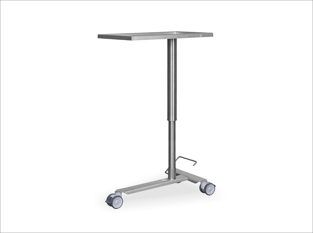 Stolik medyczny wykonany ze stali nierdzewnej Zagłębiony blat podnoszony przy pomocy dźwigni nożnej. Podstawa w kształcie litery T z trzema podwójnymi kółkami z hamulcem. Stolik jest dedykowany placówkom medycznym a w szczególności salom operacyjnym i zabiegowym. Blat posiada specjalnie profilowany rant powierzchni roboczej, który zapobiega zsuwaniu się leżących na nim przedmiotów. Stolik posiada koła o średnicy 100 mm z hamulcem. Blat stolika chirurgiczno zabiegowego jest stały. WYMIARY STOLIKA CHIRURGICZNO ZABIEGOWEGO”LABO” TYPU MAYO:Podstawa – kształt litery T (szer. x dł.): 450 x 750mmWysokość blatu (min. x max.): 902 x 1302mmWymiary blatu (szer. x dł. x gł.): 445 x 745 x 25mmWymiary blatu w środku (szer. x dł.): 401 x 701mmMaksymalne dopuszczalne obciążenie (wewnątrz) 15 kgWaga stolika: 24,5 kg