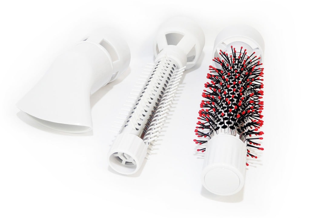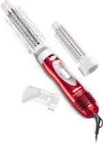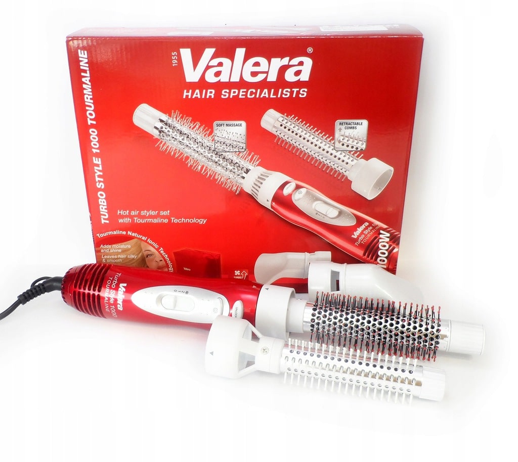 Profesjonalna suszarko-lokówka VALERA TURBO STYLE 1000 TOURMALINE z 3 końcówkami: Ta rewelacyjna suszarko-lokówka posiada trzy zmienne końcówki, które dają możliwość dostosowania rozmiaru szczotek lub zmianę ich na koncentrator. Ponadto urządzenie posiada trzy prędkości nawiewu oraz przycisk zimnego powietrza. Jest bardzo łatwe w obsłudze i zapewni Tobie przyjemną pracę. W zestawie znajdziesz: termoszczotkę modelującą 25mm; termoszczotkę modelującą 22mm z chowanymi kolcami; nasadkę koncentrującą strumień powietrza; kosmetyczkę, która pomieści te wszystkie elementy. Lokówko-suszarka posiada wiele cech profesjonalnego narzędzia do stylizacji włosów: moc 1000 wat; technologia turmalinowa; 3 ustawienia prędkości i nawiewu; przycisk zimnego powietrza Cool; łatwa wymiana końcówek; przycisk Turbo do szybkiego suszenia. Technologia turmalinowa dla lśniących włosów Suszarki turmalinowe charakteryzują się niebywałą trwałością i co najważniejsze jak dowodzą badania, turmalin wytwarza dodatkową jonizację dzięki której nasze włosy są gładkie, zdrowe i bardziej błyszczące.