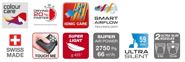 Profesjonalna i bardzo lekka suszarka do włosów Valera VANITY COMFORT Pretty Purple – Mocny i wytrzymały silnik DC-PRO Motor – Moc – 2000 W – Przycisk chłodnego nawiewu – Prędkość nawiewu – 120 km/h – ULTRA CICHA – głośność tylko 59 db – SMART AIR FLOW – technologia optymalnego przepływu powietrza przez suszarkę daje bardzo wysokie osiągi – Dzięki SMART AIR FLOW czas suszenia jest krótszy nawet o 20%** – 6 kombinacji nawiewu/temperatury – 2 wąskie dysze koncentrujące nadmuch powietrza ( 6 i 7,5 cm ) – Wąska nienagrzewająca się dysza TOUCH ME – Wytrzymałość silnika – 1200 godzin pracy – Bardzo niska waga – tylko 425g ( waga bez kabla ) – Generator jonów – 3 metrowy obrotowy kabel ROTOCORD z uchwytem SuperFlex – Zdejmowana metalowa osłona silnika – Produkowana w Szwajcarii SMART AIR FLOW – nowoczesna konstrukcja suszarek Valera optymalizuje przepływa powietrza przez suszarkę. Dzięki niej zwiększamy ilość powietrza przepływającego przez suszarkę i jego prędkość. Smart Air Flow dodatkowo zmniejsza hałas generowany przez przepływające powietrze.