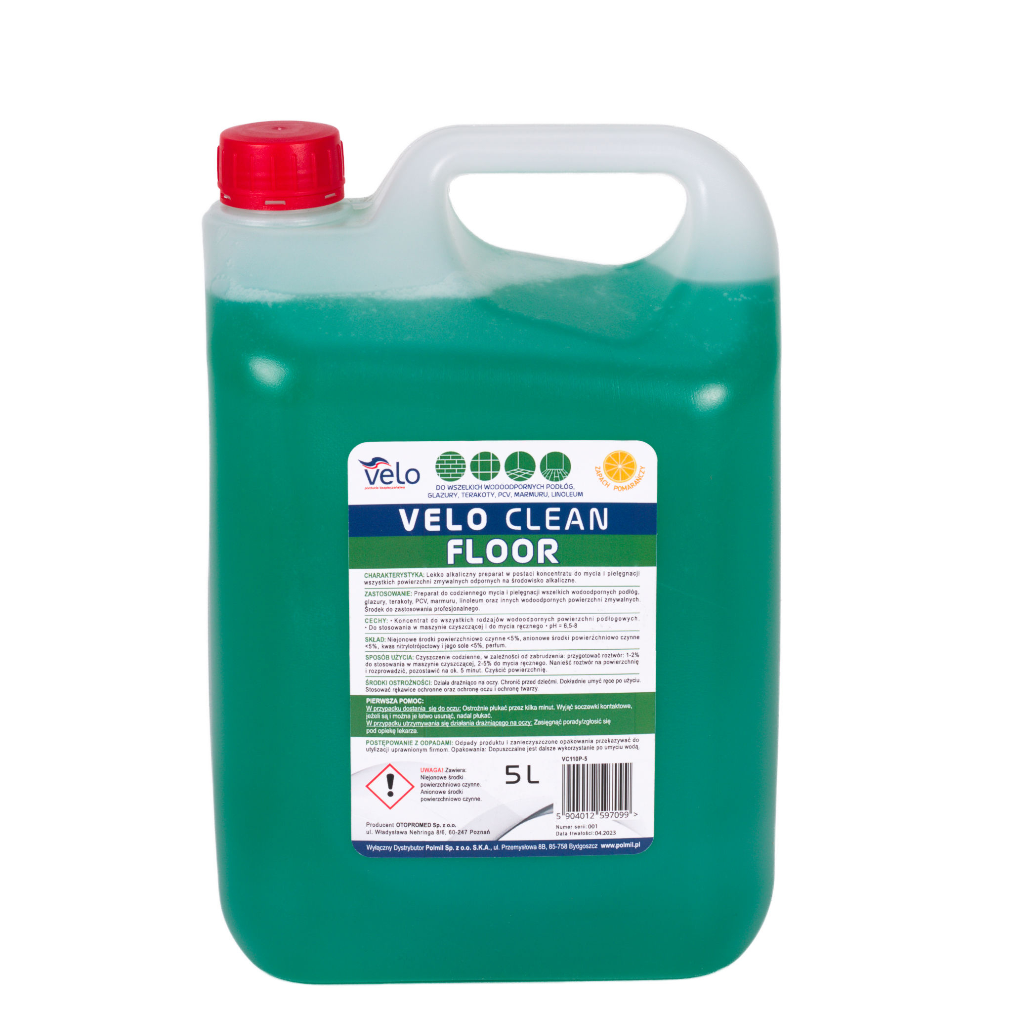 VELO CLEAN FLOOR 5L Koncentrat do codziennego mycia i pielęgnacji podłóg Preparat do użytku profesjonalnego polecany do wszelkich wodoodpornych podłóg, glazury, terakoty, PCV, marmuru, linoleum. CHARAKTERYSTYKA: Lekko alkaliczny preparat w postaci koncentratu do mycia i pielęgnacji wszystkich powierzchni zmywalnych odpornych na środowisko alkaliczne. ZASTOSOWANIE: Preparat do codziennego mycia i pielęgnacji wszelkich wodoodpornych podłóg, glazury, terakoty, PCV, marmuru, linoleum oraz innych wodoodpornych powierzchni zmywalnych. Środek do zastosowania profesjonalnego. CECHY: Koncentrat do wszystkich rodzajów wodoodpornych powierzchni podłogowych. • Do stosowania w maszynie czyszczącej i do mycia ręcznego pH = 6,5-8 SKŁAD: Niejonowe środki powierzchniowo czynne