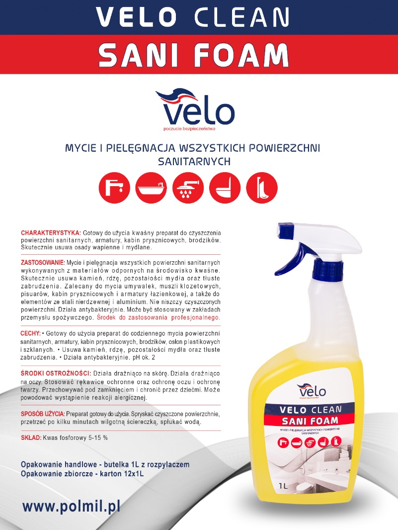 VELO CLEAN SANI FOAM 1l – Gotowy do użycia preparat do czyszczenia powierzchni sanitarnych CHARAKTERYSTYKA: Gotowy do użycia kwaśny preparat do czyszczenia powierzchni sanitarnych, armatury, kabin prysznicowych, brodzików. Skutecznie usuwa osady wapienne i mydlane. ZASTOSOWANIE: Mycie i pielęgnacja wszystkich powierzchni sanitarnych wykonywanych z materiałów odpornych na środowisko kwaśne. Skutecznie usuwa kamień, rdzę, pozostałości mydła oraz tłuste zabrudzenia. Zalecany do mycia umywalek, muszli klozetowych, pisuarów, kabin prysznicowych i armatury łazienkowej, a także do elementów ze stali nierdzewnej i aluminium. Nie niszczy czyszczonych powierzchni. Działa antybakteryjnie. Może być stosowany w zakładach przemysłu spożywczego. Środek do zastosowania profesjonalnego. CECHY: Gotowy do użycia preparat do codziennego mycia powierzchni sanitarnych, armatury, kabin prysznicowych, brodzików, osłon plastikowych i szklanych. Usuwa kamień, rdzą, pozostałości mydła oraz tłuste zabrudzenia. Działa antybakteryjnie. pH ok. 2 SKŁAD: Kwas fosforowy 5-15 % SPOSÓB UŻYCIA: Preparat gotowy do użycia. Spryskać czyszczone powierzchnie, przetrzeć po kilku minutach wilgotną ściereczką spłukać wodą. ŚRODKI OSTROŻNOŚCI: Działa drażniąco na skórę. Działa drażniąco na oczy Stosować rękawice ochronne oraz ochronę oczu i ochronę wystąpienie reakcji alergicznej.