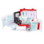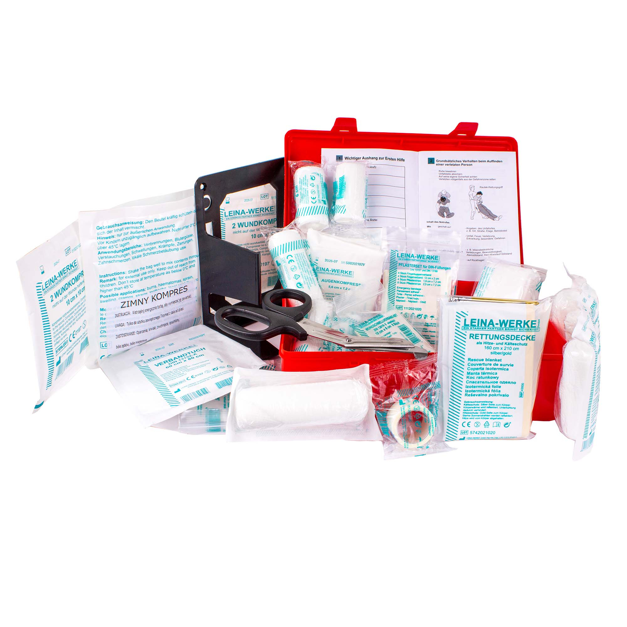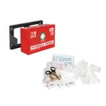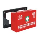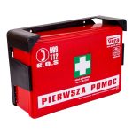Apteczka w pudełku z tworzywa ze stelażem mocującym do ściany. Kolor apteczki: czerwonyRozmiar opakowania: 255 x 165 x 85 mmWaga: 0,7 kg Wyrób spełnia wymagania norm Unii Europejskiej Skład zgodny z normą DIN 13157 PLUS 1 szt. Kompres zimny2 szt. Kompres na oko3 szt. Kompres 10 x 10cm (pak po 2 szt.)2 szt. Opaska elastyczna 4m x 6cm2 szt. Opaska elastyczna 4m x 8cm1 kpl. Plaster 10 x 6 cm (8szt.)1 kpl. Zestaw plastrów (20szt.)1 szt. Przylepiec 5m x 2,5 cm1 szt. Opatrunek indywidualny G3 szt. Opatrunek indywidualny M1 szt. Opatrunek indywidualny K1 szt. Chusta opatrunkowa 60 x 80cm2 szt. Chusta trójkątna1 kpl. Chusta z flizeliny (5 szt.)1 szt. Koc ratunkowy 160 x 210 cm1 szt. Nożyczki 19 cm4 szt. Rękawice winylowe2 szt. Worek foliowy 30×40 cm4 szt. Chusteczka dezynfekująca1 szt. Instrukcja udzielania pierwszej pomocy wraz z wykazem telefonów alarmowycha