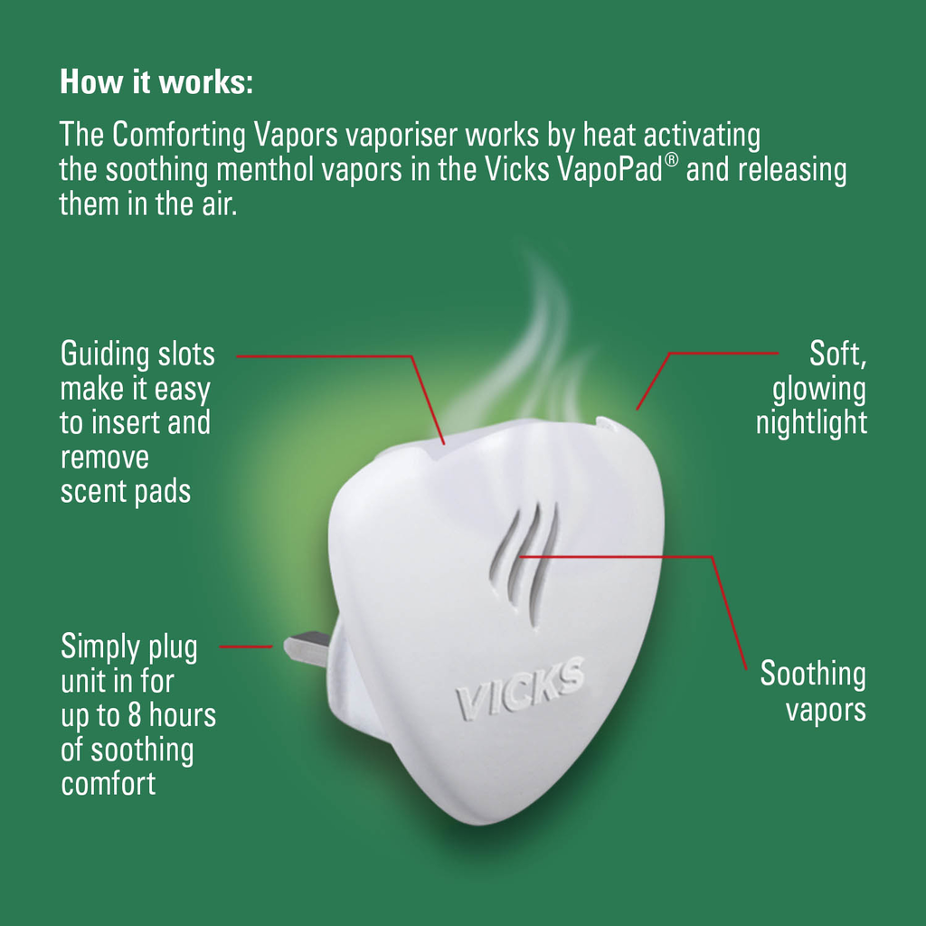Dyfuzor naturalnych olejków do kontaktu Nieoceniona pomoc z łagodzeniem kaszlu i przeziębienia oferujący naturalne składniki.Pochodzące z roślin olejki, oferujące korzyści dla zdrowia i komfortu. Poprzez rozprowadzanie olejków eterycznych w powietrzu, możesz stworzyć relaksujący nastrój, pomagający swoim dzieciom radzić sobie z dyskomfortem przeziębienia oraz kaszlu. Wystarczy włożyć Vicks Comforting VapoPads do odświeżacza i podłączyć go do gniazdka. Ciepło aktywuje naturalne olejki eteryczne. W ciągu 30 do 60 min minut zapach wypełni pomieszczenie. Jeden wkład zapewni do 8h zapachu, komfortu i dobrego samopoczucia. Vicks Comforting Vaporos świeci łagodnie, stając się przy tym światłem nocnym. Odświeżacz Vicks, jest całkowicie przenośny i może być używany w każdym pomieszczeniu, sprawdza się w domu jak i w podróży. W zestawie 5 wkładów VapoPads o zapachu mentolowym.