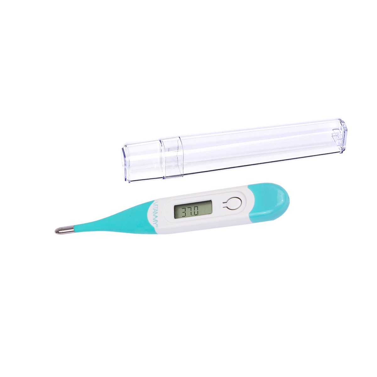 Termometr elektroniczny Vitammy Daily z elastyczną końcówką Elastyczna końcówka. Łatwa obsługa jednym przyciskiem. Dokładny pomiar w 60 sekund. Dźwięk zakończenia pomiaru. Możliwość mierzenia temperatury w ustach, pod pachą oraz rektalnie. Etui na termometr w zestawie. Wyświetlacz LCD.