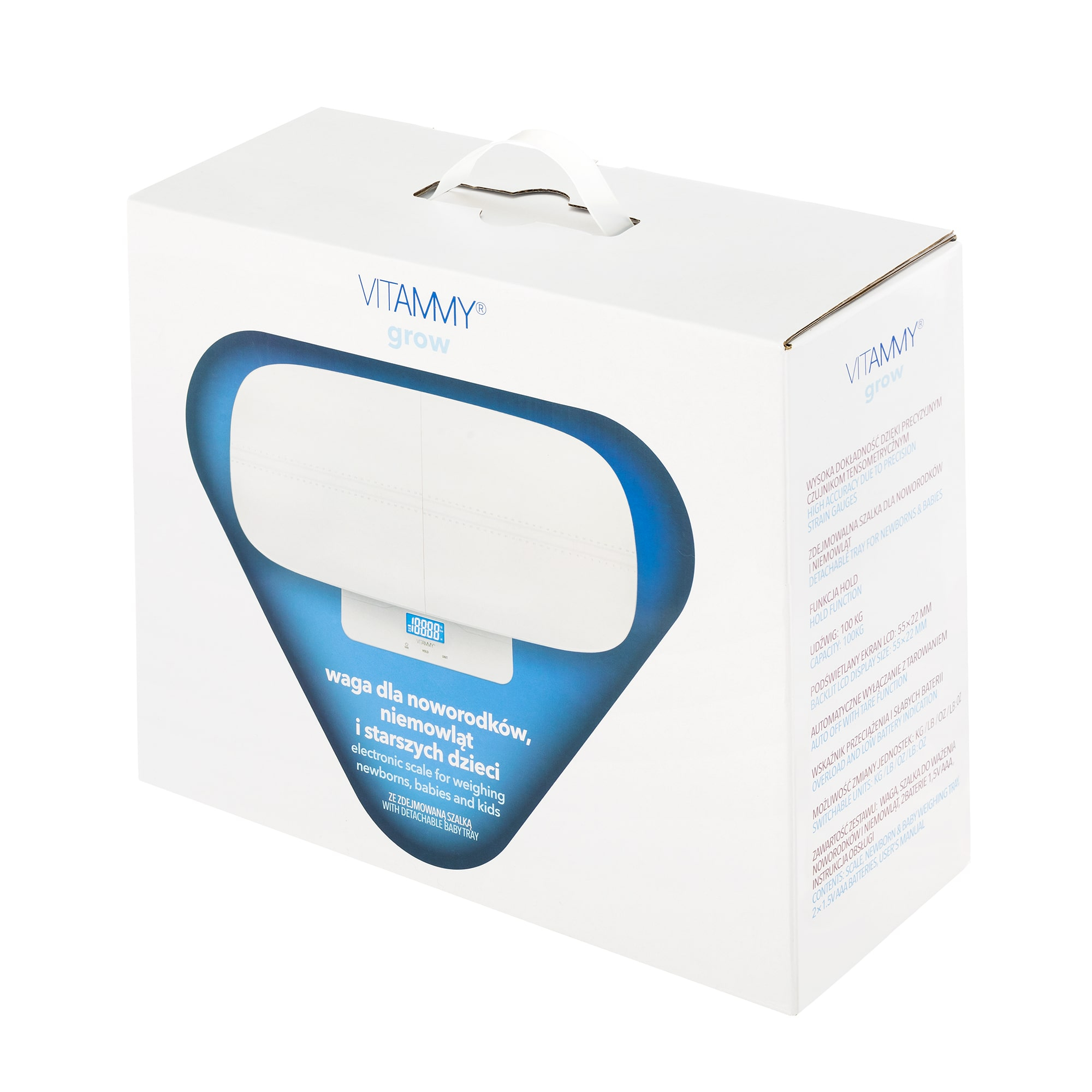 Vitammy Grow waga, która zmienia się wraz z twoim dzieckiem Ta elektroniczna waga to domowe urządzenie przydatne dla wszystkich członków rodziny. Nadaje się do ważanie noworodków, niemowląt, dzieci i dorosłych. Dołożyliśmy wszelkich starań, aby produkt był najwyższej jakości, komfortowy dla dziecka, łatwy wu życiu i bezpieczny podczas ważenia. Wyjątkowo dokładna waga dla noworodków i niemowląt Vitammy Grow ze zdejmowaną szalką pozwala na bezpieczne i dokładne ważenie noworodka i kontrolę nad stanem zdrowia maluch dzień po dniu. Odpowiednia także dla starszych dzieci W kilka sekund można zdjąć szalkę i użyć Vitammy Grow do ważenia dzieci i dorosłych do 100 kg. Vitammy Grow waga dla niemowląt, noworodków i dzieci: Wysoka dokładność dzięki precyzyjnym czujnikom tensorycznym. Zdejmowana szalka dla noworodków i niemowląt Funkcja HOLD- pozwala na ważenie ruszającego się noworodka bez nerwów i obawy o dokładność Udźwig 100 kg Podświetlany ekran LED: 55 x 22 mm Automatyczne wyłączanie z tarowaniem Wskaźnik przeciążenia i słabych baterii Możliwość zmiany jednostek kg/ lb/ oz Zawartość zestawu: waga, szalka do ważenia noworodków i niemowląt, 2 baterie 1,5V AAA, instrukcja obsługi