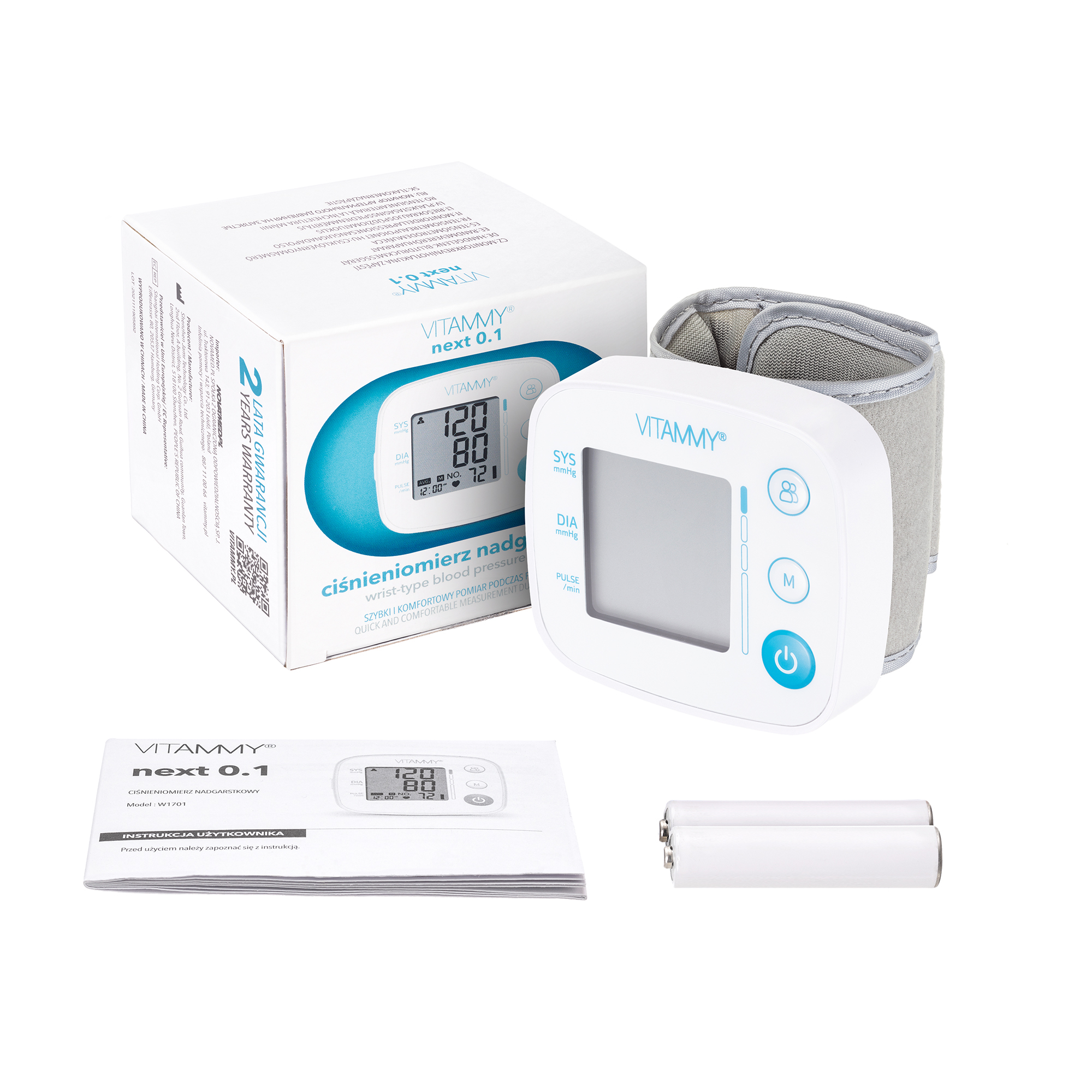 VITAMMY NEXT 0.1 – nowoczesny i dostępny, aby wybór był prosty NEXT 0.1 to ciśnieniomierz nadgarstkowy nowej generacji, który oferuje funkcje i właściwości wyprzedzające standardy, zachowując przyjazną cenę – aby wybór ciśnieniomierza pozostawał prosty. Ten nowy model w gamie NEXT wyposażony został w najnowsze technologie skracające czas pomiaru i niwelujące błędy, takie jak Pomiar Podczas Pompowania oraz Wykrywanie Poruszenia podczas pomiaru. NEXT 0.1 wykrywa arytmię, oferuje 2 użytkownikom pamięć 120 pomiarów (2×120), a także dysponuje mankietem o podwyższonym standardzie i o wyjątkowo dużym zakresie obwodu nadgarstka: 12,5 – 21,5 cm, aby każda Twoja potrzeba była zaspokojona. NEXT 0.1 – regularnie dbanie o siebie stanie się łatwiejsze Pomiar Podczas Pompowania – technologia następnej generacji dostępna jest teraz w ciśnieniomierzu nadgarstkowym. Dzięki nowoczesnej technologii komfortowego pomiaru w trakcie napełniania mankietu Twoja motywacja do wykonywania regularnych pomiarów może wzrosnąć. Mierzenie ciśnienia jest szybsze, cichsze i bardziej delikatne a regularnie dbanie o siebie łatwiejsze. Technologia komfortowego Pomiaru Podczas Pompowania – jak to działa? W ciśnieniomierzach poprzedniej generacji aktywna faza pomiaru rozpoczynała się dopiero po napełnieniu mankietu do określonej wartości i przebiegała podczas stopniowego i powolnego jego opróżniania. Wiązało się to z dłuższym czasem oczekiwania na wynik ze ściśniętym ramieniem. Ciśnieniomierze nowej generacji, dzięki technologii Pomiaru Podczas Pompowania, rozpoczynają pomiar tuż po rozpoczęciu napełniania mankietu i kontynuują analizę wraz z delikatnym zwiększaniem ciśnienia tylko do momentu osiągnięcia górnej wartości ciśnienia skurczowego. Taki pomiar przebiega szybciej i wiąże się to z odczuwaniem większego komfortu przez użytkownika. Zobacz, jak wykorzystać wszystkie zalety nowoczesnego ciśnieniomierza nadgarstkowego NEXT 0.1 Dzięki kieszonkowym rozmiarom, szybkiemu i cichemu pomiarowi podczas pompowania nie musisz czekać na idealny moment, aby zmierzyć ciśnienie – z NEXT 0.1 wcale nie potrzebujesz na to dużo czasu i miejsca. Ciśnieniomierz NEXT 0.1 możesz wszędzie zabrać ze sobą, co daje Ci możliwość pomiaru w różnych codziennych lub niecodziennych sytuacjach, np. w samochodzie, pociągu, przy biurku, na sofie przed telewizorem. Możesz znaleźć czas na kontrolę ciśnienia w okolicznościach, w których nie było to możliwe łatwe ciśnieniomierzem naramiennym. Posiada wszystkie niezbędne funkcje VITAMMY NEXT 0.1 posiada funkcje diagnostyczne, które zwiększają wiarygodność pomiaru i spektrum zastosowań, a także eliminują częste błędy: Wykrywanie nieregularnego rytmu serca (m.in. arytmii) Uśrednianie ostatnich 3 wyników pomiarów – niweluje wpływ chwilowych anomalii, w tym efektu “białego fartucha” Interpretacja wyniku pomiaru według wytycznych WHO – wiesz, kiedy należy o siebie zadbać Wykrywanie poruszenia podczas pomiaru – pomaga wyeliminować wpływ jednego z najczęstszych błędów popełnianych podczas pomiaru Wysoki standard mankietu – możesz to poczuć Mankiet o podwyższonym standardzie wykonany ze specjalnej dzianiny i z materiałów najwyższej jakości: zapewnia poczucie większego komfortu, jest trwały i dłużej zachowuje swoje właściwości. Nowy rodzaj zapięcia (rzep) zwiększa wygodę użytkowania dzięki łatwiejszemu zapinaniu i rozpinaniu przy obniżonym poziomie hałasu. 12,5 – 21,5 cm to wyjątkowo uniwersalny zakres regulacji mankietu nadgarstkowego zaspakający potrzeby większości użytkowników. Certyfikowana wiarygodność Next 0.1 to certyfikowany wyrób medyczny posiadające Certyfikat CE (Certyfikat Zgodności) wydany przez autoryzowaną jednostkę notyfikowaną EU: TÜV SÜD PRODUCT SERVICE GMBH RIDLERSTR 65, D-80339 MÜNCHEN, NIEMCY. Zaznaj spokoju, używając ciśnieniomierza zgodne z szeregiem wymagań dotyczących wiarygodności pomiaru (badania kliniczne), odporności za zakłócenia elektromagnetyczne, bezpieczeństwa użytkowania, prawidłowego oznakowania produktu, itp. Duży ekran w kompaktowej obudowie VITAMMY NEXT 0.1 wyposażony został w duży, czytelny ekran, którego nie powstydziłby się niejeden ciśnieniomierz naramienny – mimo tego jego obudowa pozostaje kompaktowa i lekka. Ekologiczne i ekonomiczne VITAMMY NEXT 0.1 Dzięki zasilaniu tylko 2 bateriami AAA oszczędzasz i postępujesz ekologicznie, zyskując zdrowie. Sporo miejsca na wspólne dbanie o zdrowie 2 tory pamięci po 120 wyników. Polska marka VITAMMY – otrzymujesz znacznie więcej niż produkt VITAMMY to polska marka. Dbamy o to, aby nasze produkty spełniały potrzeby lokalnych odbiorców i pomagały rozwiązywać aktualne problemy. Zapewniamy polskie opisy, instrukcję w języku polskim oraz kontakt z Infolinią Pomocy i Wsparcia Technicznego w języku polskim. Pozostajemy w kontakcie: Wsparcie i Pomoc Infolinii 887 11 00 66 Masz pytania dotyczące wyboru produktu, jego użytkowania, masz wątpliwości, potrzebujesz wsparcia – skontaktuj się z profesjonalną Infolinią Pomocy i Wsparcia Techniczego VITAMMY. Gwarancja jako obietnica jakości VITAMMY Ciśnieniomierz VITAMMY NEXT 0.1 objęty jest 2-letnią gwarancją w ramach OBIETNICY JAKOŚCI VITAMMY, która obejmuje zapewnienie jakości technicznej urządzenia, wartości pomiarowej i użytkowej urządzenia, jak i wsparcia użytkownika w zakresie obsługi i rozwiązywania problemów, a także dostępności akcesoriów. Seria ciśnieniomierzy VITAMMY NEXT Wybierz swój nowy, doskonale dopasowany ciśnieniomierz z najbardziej kompletnej serii VITAMMY NEXT i zacznij dbać o prawidłowe ciśnienie krwi już teraz. VITAMMY NEXT 0.1 to naramienny ciśnieniomierz elektroniczny, który warto mieć zawsze przy sobie. Vitammy Next 0.1 ma szereg przydatnych funkcji ułatwiających dokładny pomiar ciśnienia w ka