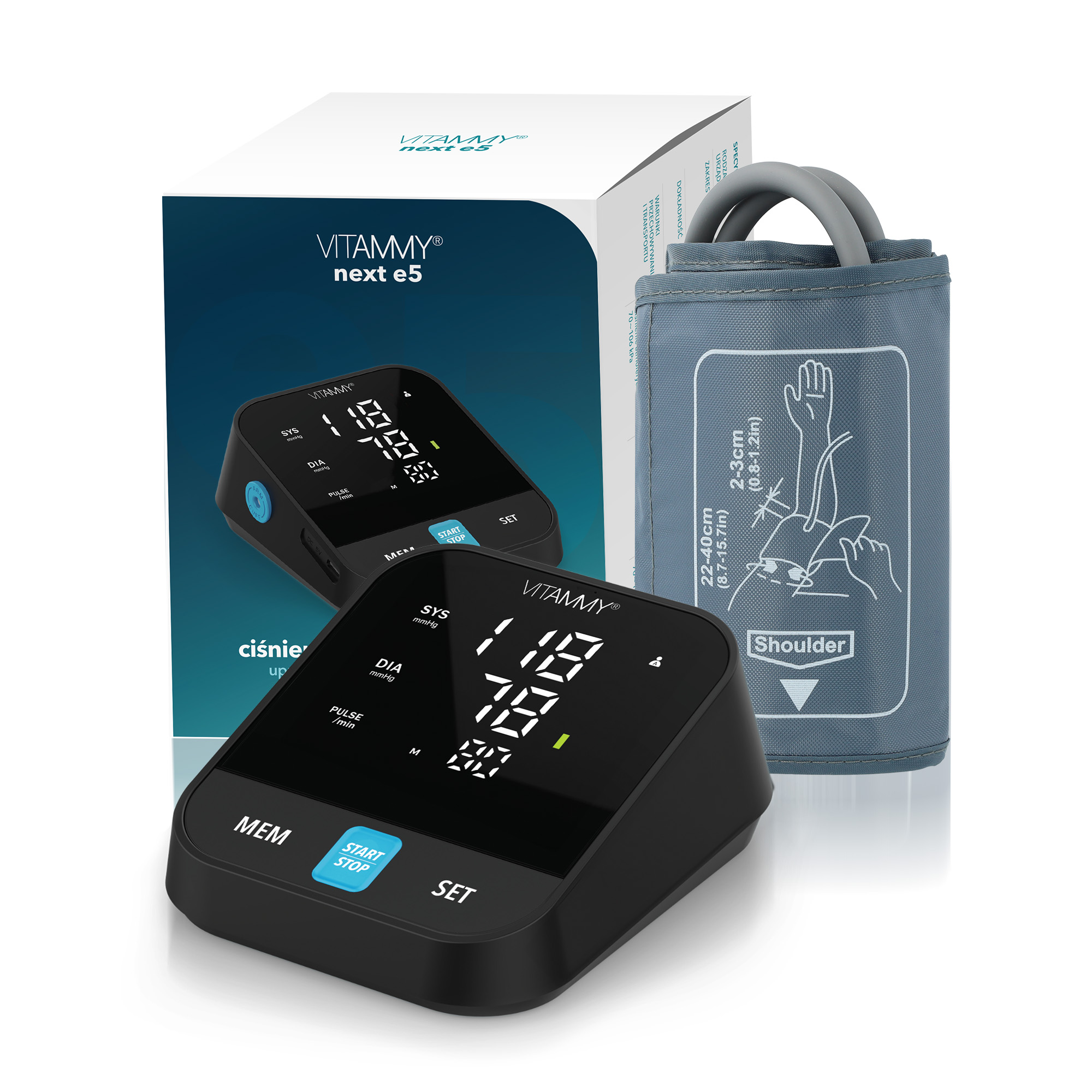 VITAMMY NEXT E5 Ciśnieniomierz elektroniczny naramienny, mówi po polsku, etui, zasilacz
