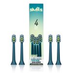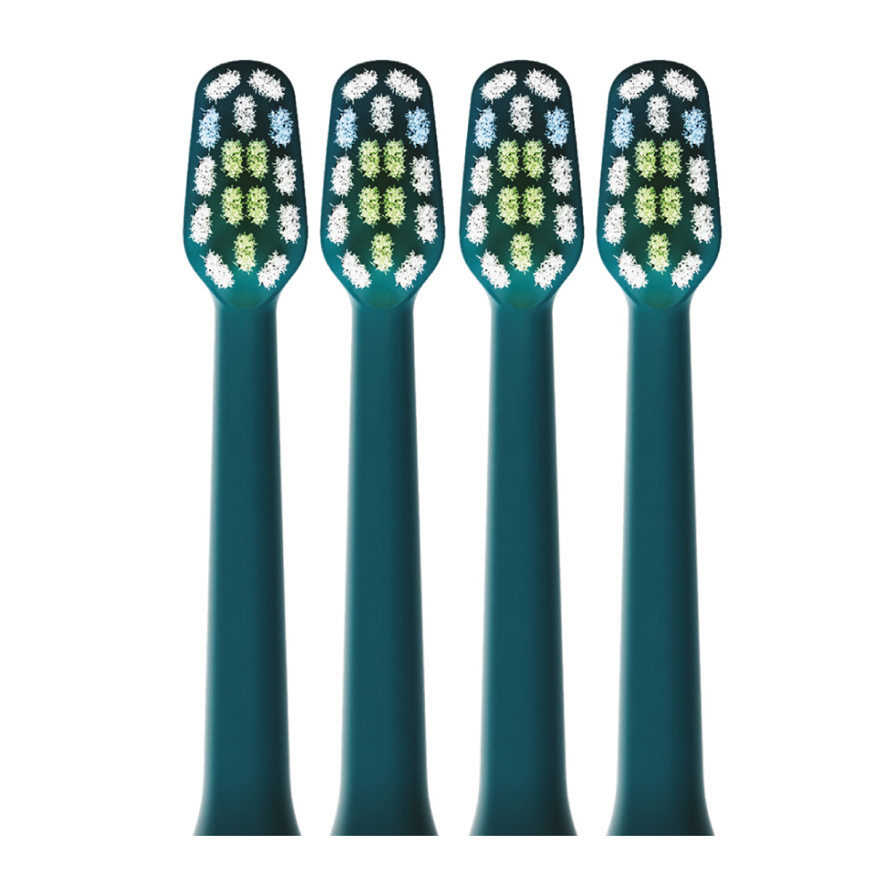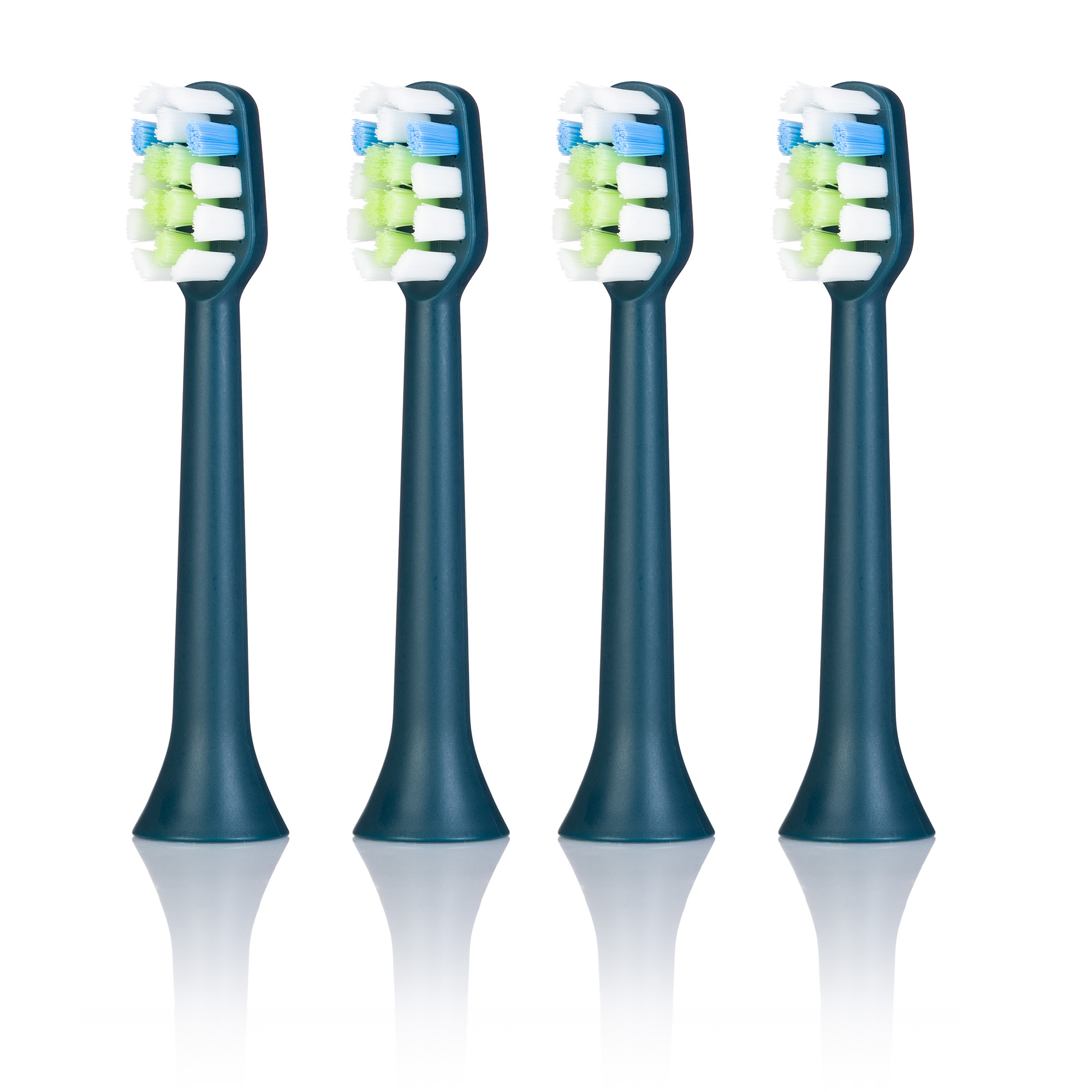 Końcówki do szczoteczki sonicznej Vitammy Smils. W opakowaniu 4 sztuki w ciemnych kolorach. Ciemne końcówki z dwoma kolorami włosia. Stopniowo odbarwiające się włókna główki wskazującymi na stopień zużycia i konieczność zmiany główki.
