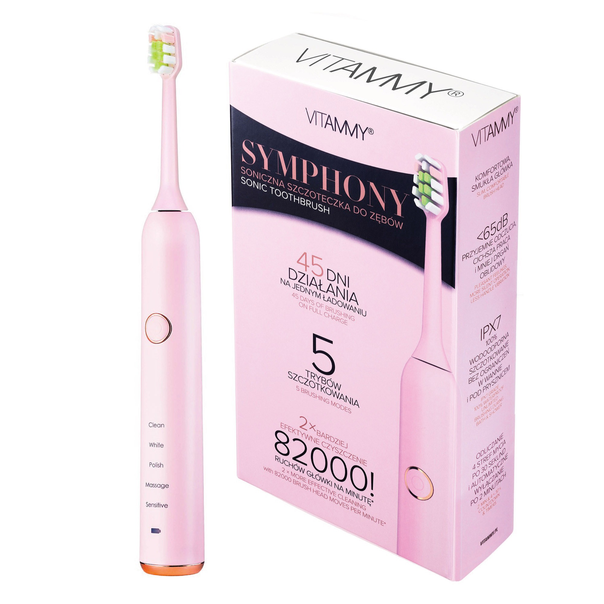 Soniczna szczoteczka do zębów Vitammy Symphony. Nowa szczoteczka soniczna o bardzo wysokiej mocy drgań i wyciszonej obudowie. Mycie soniczną szczoteczką jeszcze nigdy nie było tak komfortowe. Naładowana szczoteczka działa 45 dni, to unikatowa bateria pozwalająca na niezależność. Szczoteczkę ładować można przy pomocy dowolnych urządzeń zasilających USB i indukcyjnej ładowarki. 5 trybów szczotkowania i odliczanie 4 stref mycia dopasuje szczoteczkę do twoich wymagań i potrzeb. 45 dni działania na jednym ładowaniu. Pojemny akumulator pozwala pracować na jednym ładowaniu aż do 45 dni pracy, przy założeniu mycia zębów 2 razy dziennie. 5 trybów szczotkowania. 82000 ruchów główki na minutę. Vitammy Symphony to 2 x bardziej efektywne czyszczenie dzięki zwiększonej ilości ruchów główki. Kształt główki został zaprojektowany by dokładnie i delikatnie myć zęby. <65 dB to cichsza praca i mniej drgań obudowy czyli przyjemniejsze odczucia. IPX7 czyli 100% wodoodporna. Odliczanie 4 stref mycia po 30 sekund. Ładowarka indukcyjna USB do zasilania w każdych warunkach.