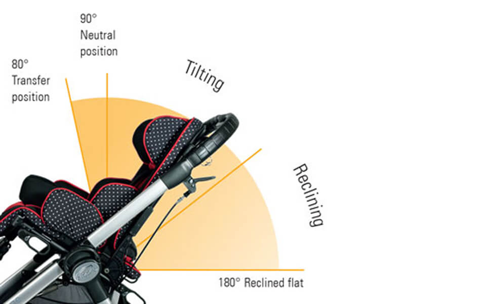 Pozycje odchylona i półleżąca ułatwiają karmienie, trawienie, oddychanie i orientację wzrokową. Any ustawić pozycję odchyloną (zakres 350°) oraz leżącą (do 180°) w wózku Zippie Voyage, wystarczy użyć hamulca, znajdującego się za oparciem.